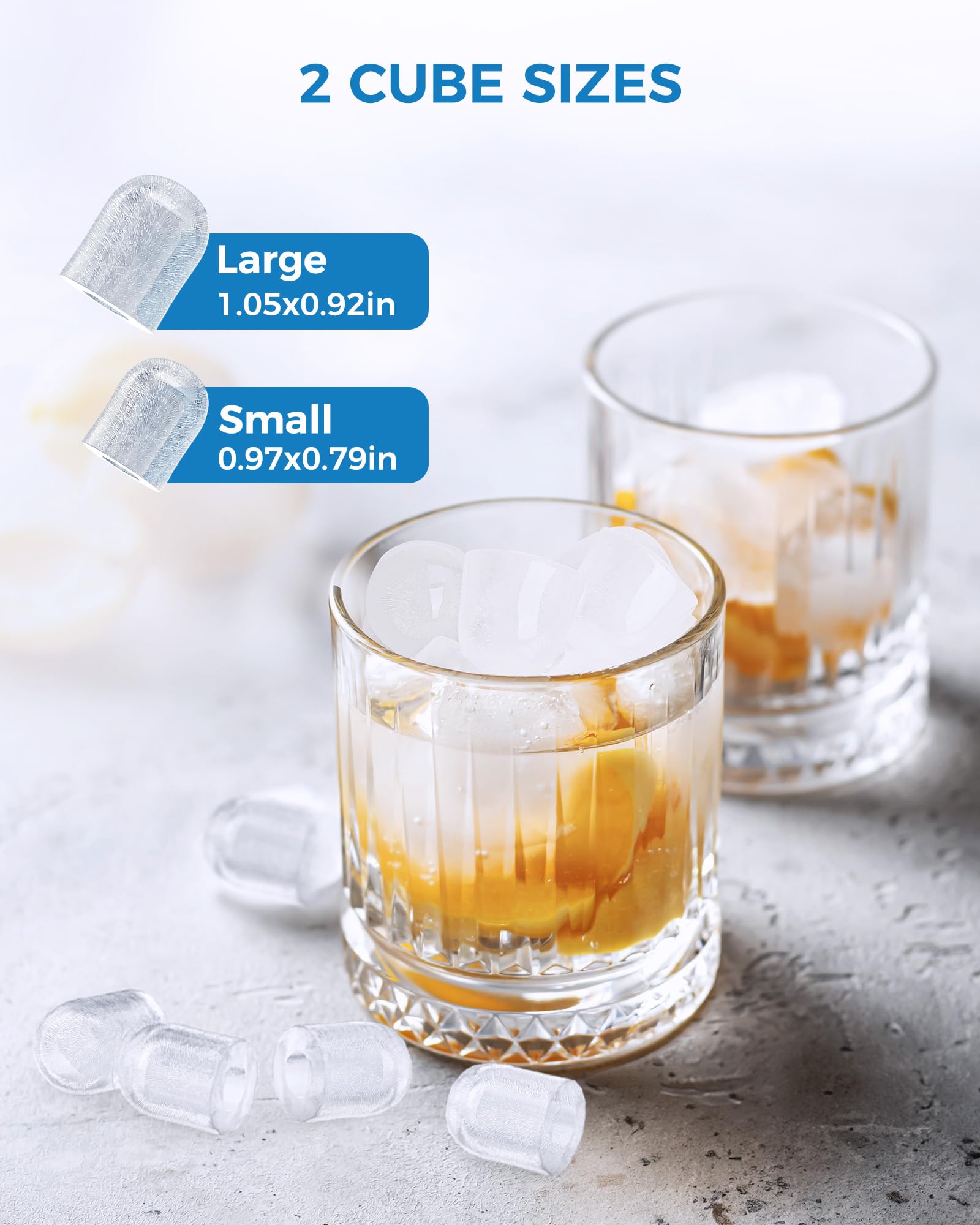 2 Sizes of Ice Cube : Our counter top ice machine offers two sizes of ice cubes. Choose larger cubes for beer, food refrigeration, and ice packs. Opt for smaller cubes to quickly chill juice, coffee, and tea. You can customize the ice cubes to suit your needs.