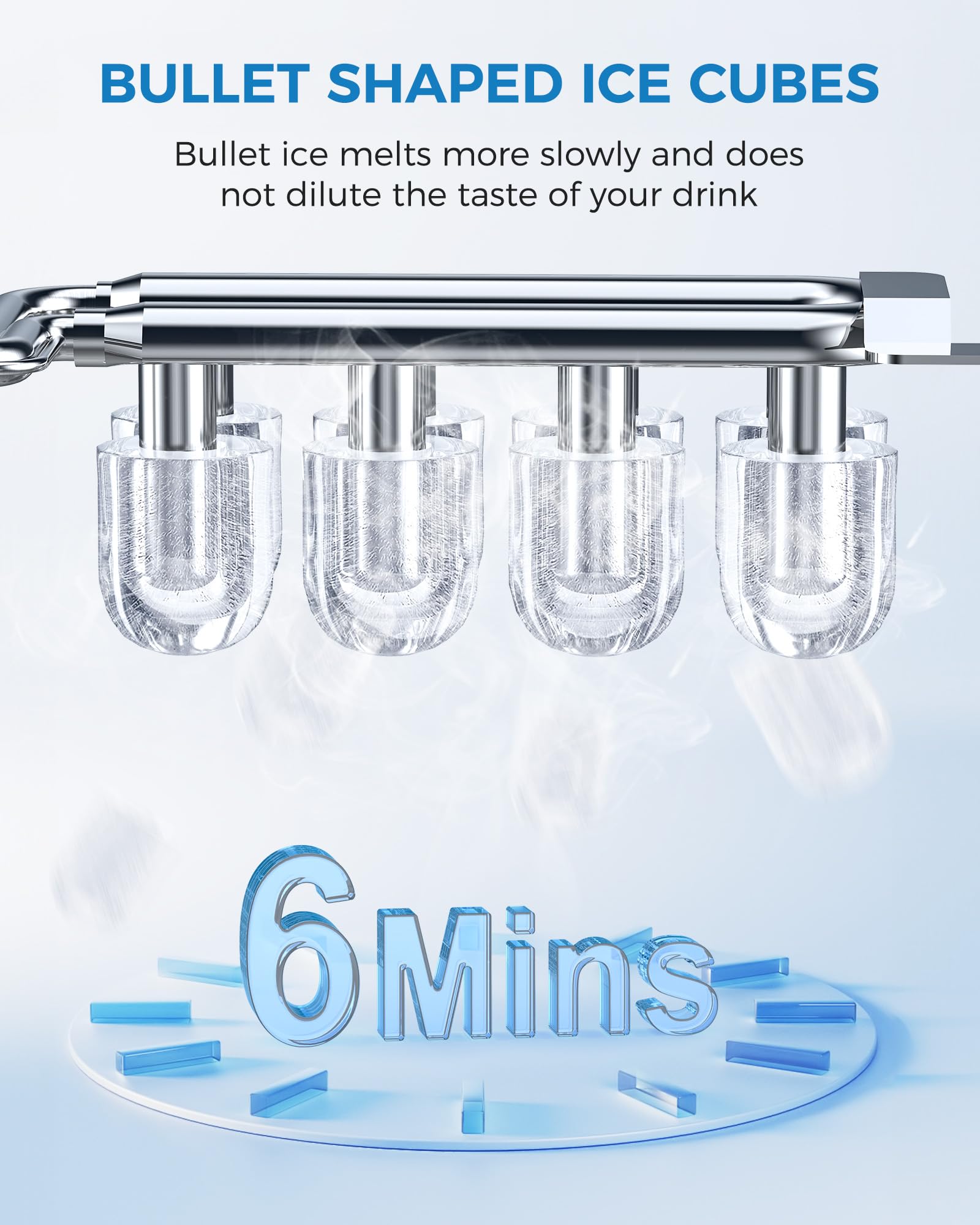 Quick Ice Making : Our ice maker delivers the first batch of fresh bullet ice in just 6 minutes. With a daily output of 26.5 pounds, it's more than enough to chase away summer heat anxiety.Enjoy a continuous supply of ice to chill beverages throughout the day.