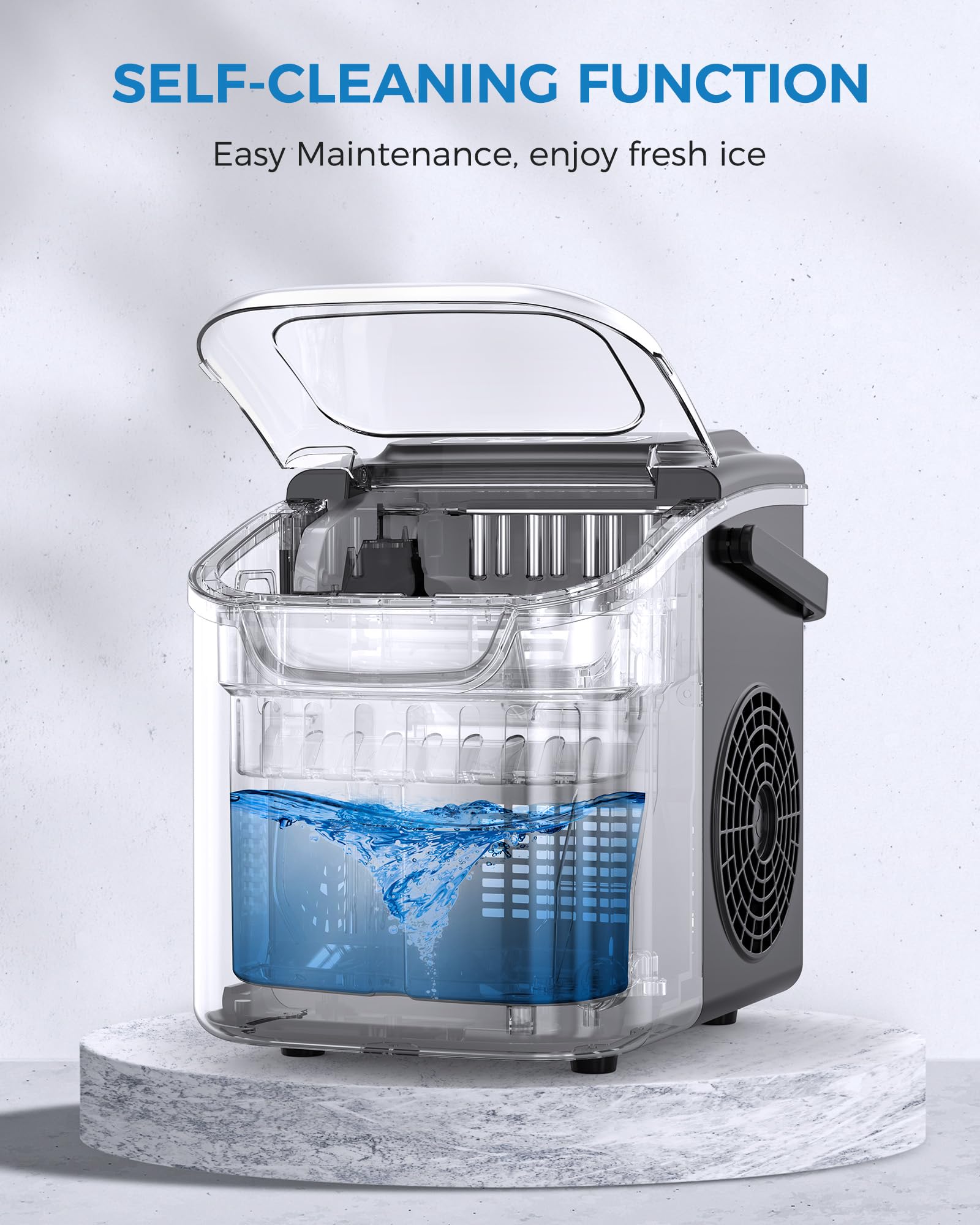 Portable and Space-Saving : This compact ice maker machine features a space-saving design and is easy to carry. You can place this counter ice machine anywhere, making it perfect for kitchens, homes, camping, RVs, parties, dorm rooms, and more.