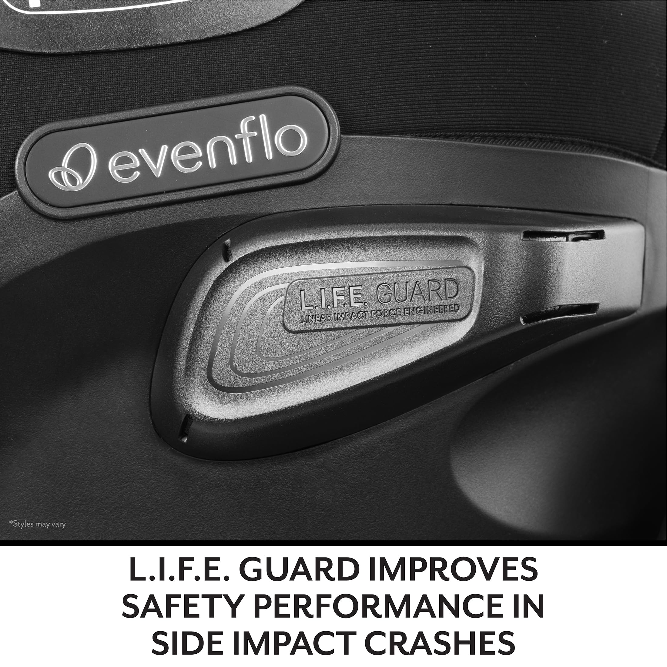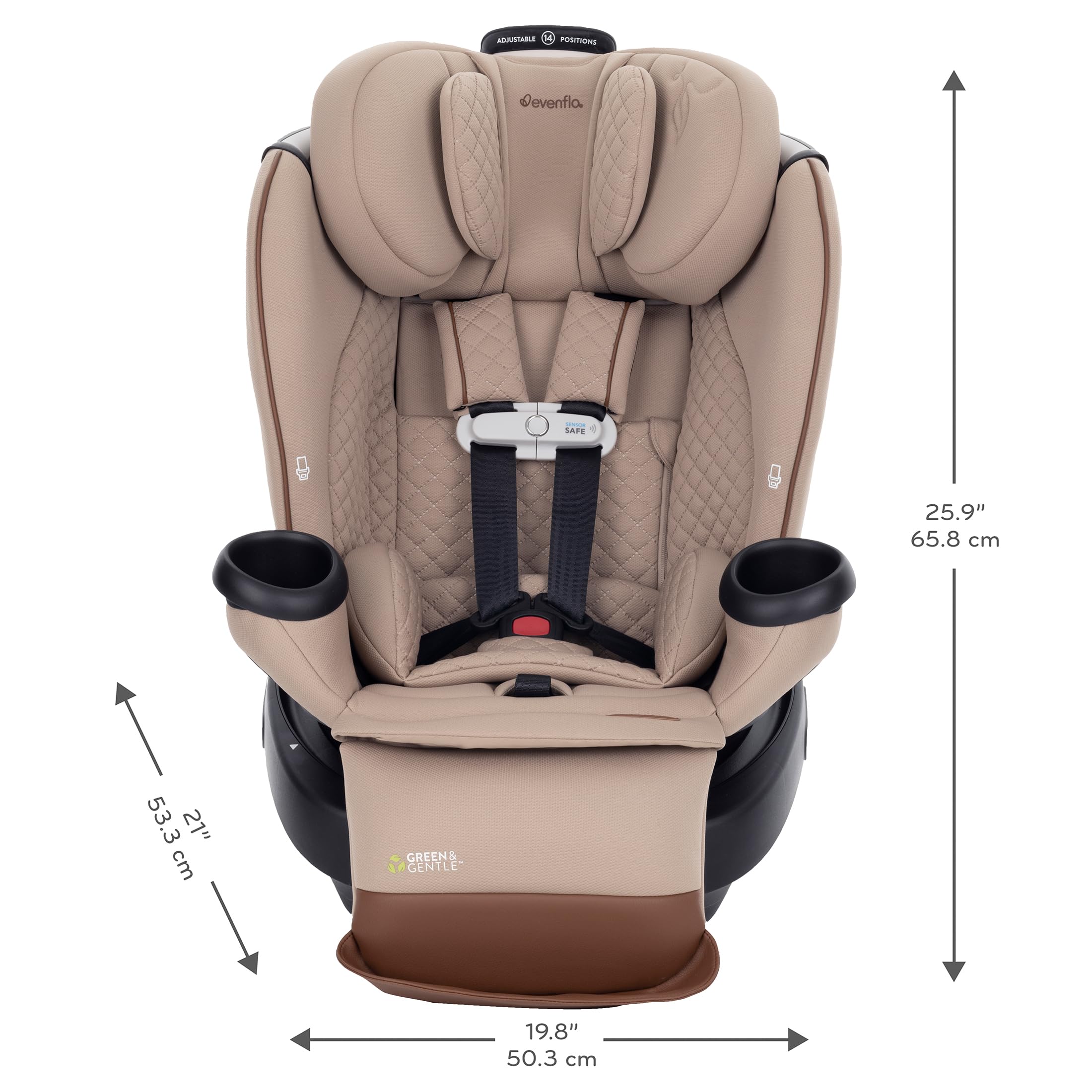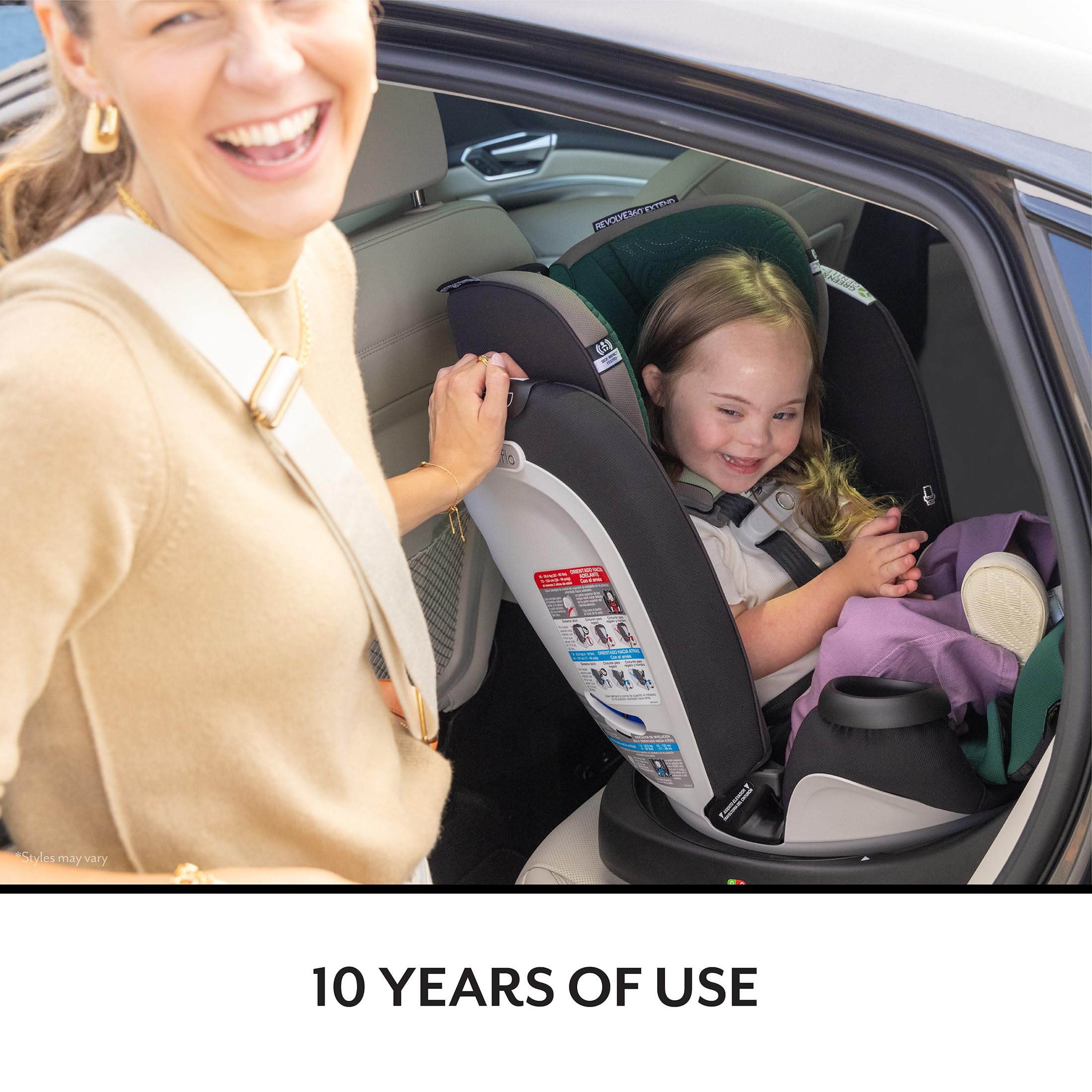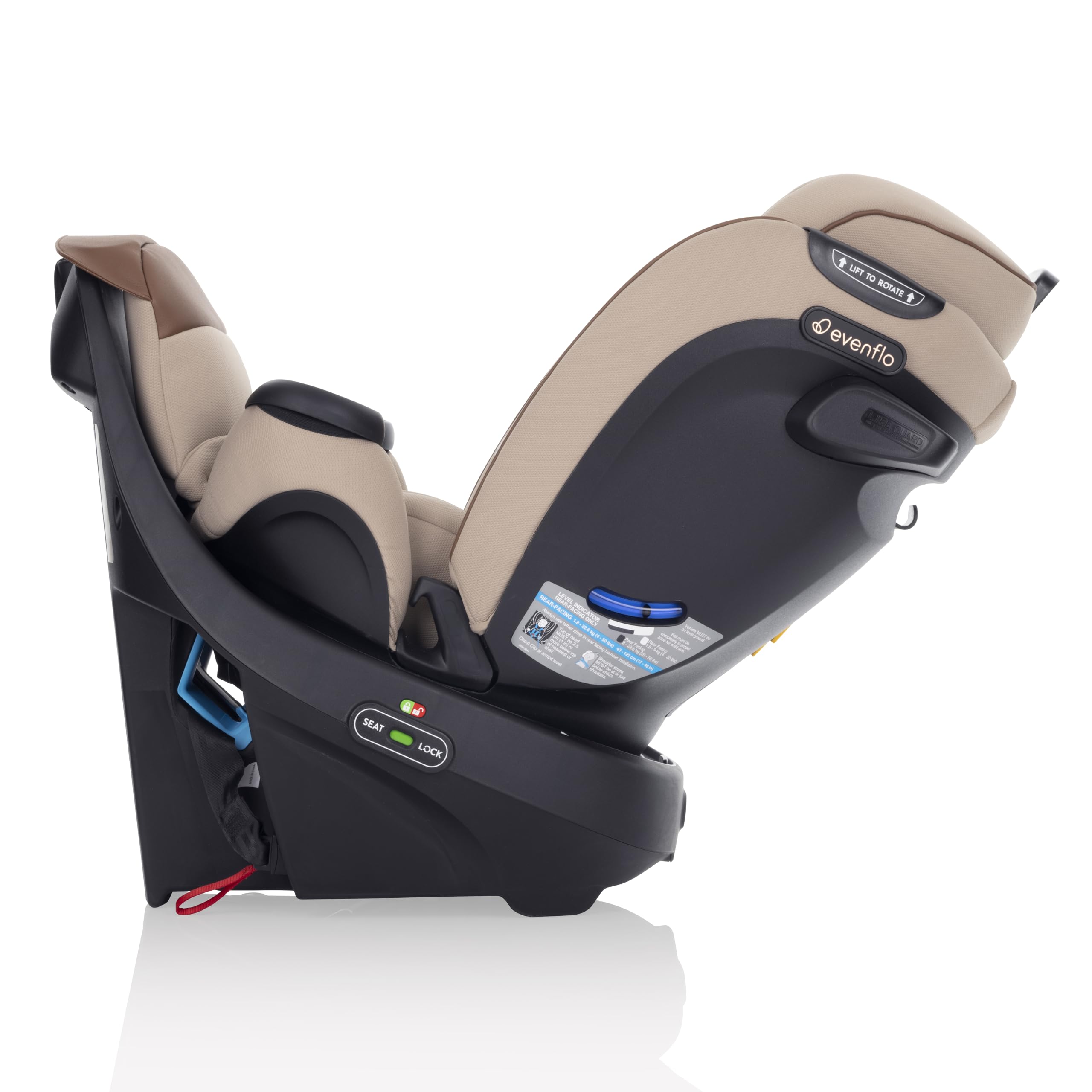 Luxe has arrived. The Target Exclusive Revolve360 Extend Rotational All-In-One Car Seat from Evenflo features a stylish, sustainable upgrade with Green & Gentle Fabric in Travertine. Americaβs #1* rotational car seat, Revolve360 Extend offers one-hand, 360Β° rotation for easy in and out. It grows with your child for up to 10 years: extended rear-facing (4-50 lb, 17-48 in.), forward-facing (30-65 lb, 35-49 in.) and booster (40-120 lb, 44-57 in.). Sustainable Green & Gentle Fabric is woven from recycled plastic bottles, free of added chemicals and flame retardants. SensorSafe technology alerts you in real-time via Bluetooth to 4 potentially unsafe conditions from your childβs car seat. Installs just once for rear-facing and forward-facing. LockStrongTM belt tensioning system provides solid, secure installation in no time. The zip-on, ergonomic leg rest adds comfort for growing legs. Cradle your child in comfort with luxurious fabric, plush padding and stylish details like leatherette trim. Additionally, this car seat features L.I.F.E. Guard β itβs Linear Impact Force Engineered to improve safety performance in side impact crashes. At Evenflo, we go above and beyond government standards to create car seats that are safe. The Evenflo Revolve360 Extend Car Seat meets or exceeds all applicable federal safety standards. In addition to federally required testing, it is structural integrity tested, rollover tested and temperature tested. If you need help installing your car seat, our ParentLink Consumer Care Team offers help online in real time. Get live video support with a certified car seat safety technician to assist with proper vehicle installation, so you can drive with confidence.