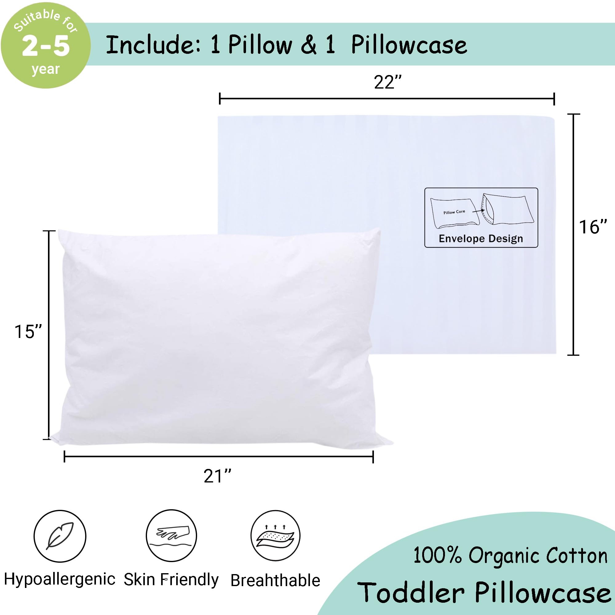 PACKAGE INCLUDE: 1 toddler pillow 15x21 and 1 toddler pillowcase 16x22, After opening the package, please wash and dry the pillow to regain its fluffiness