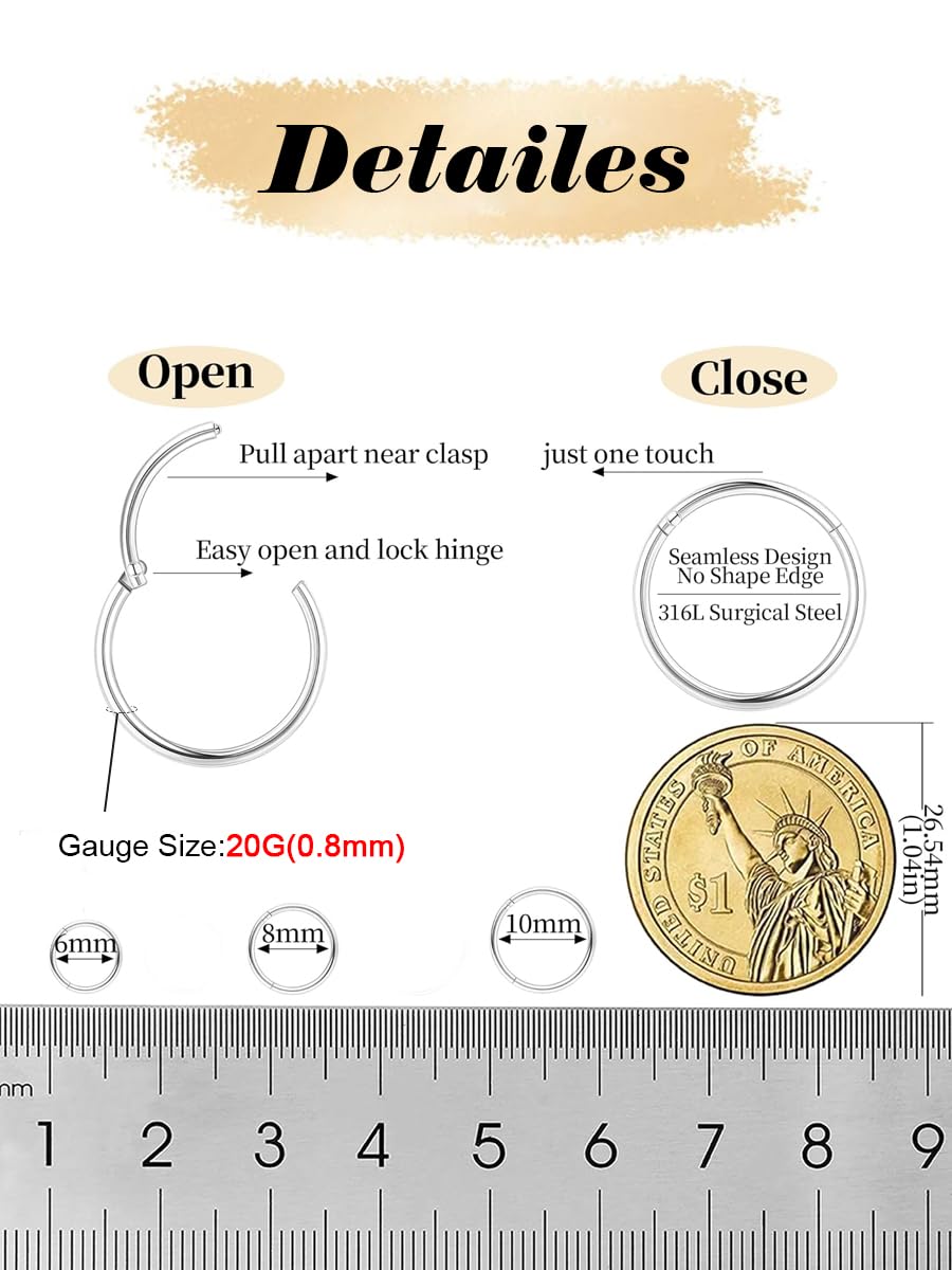 ✅ Set of 3 Silver Nose Hoops – Multiple Sizes:Includes 3 silver nose rings in 20 gauge (0.8mm) thickness with inner diameters of 6mm, 8mm, and 10mm to fit different piercing needs.