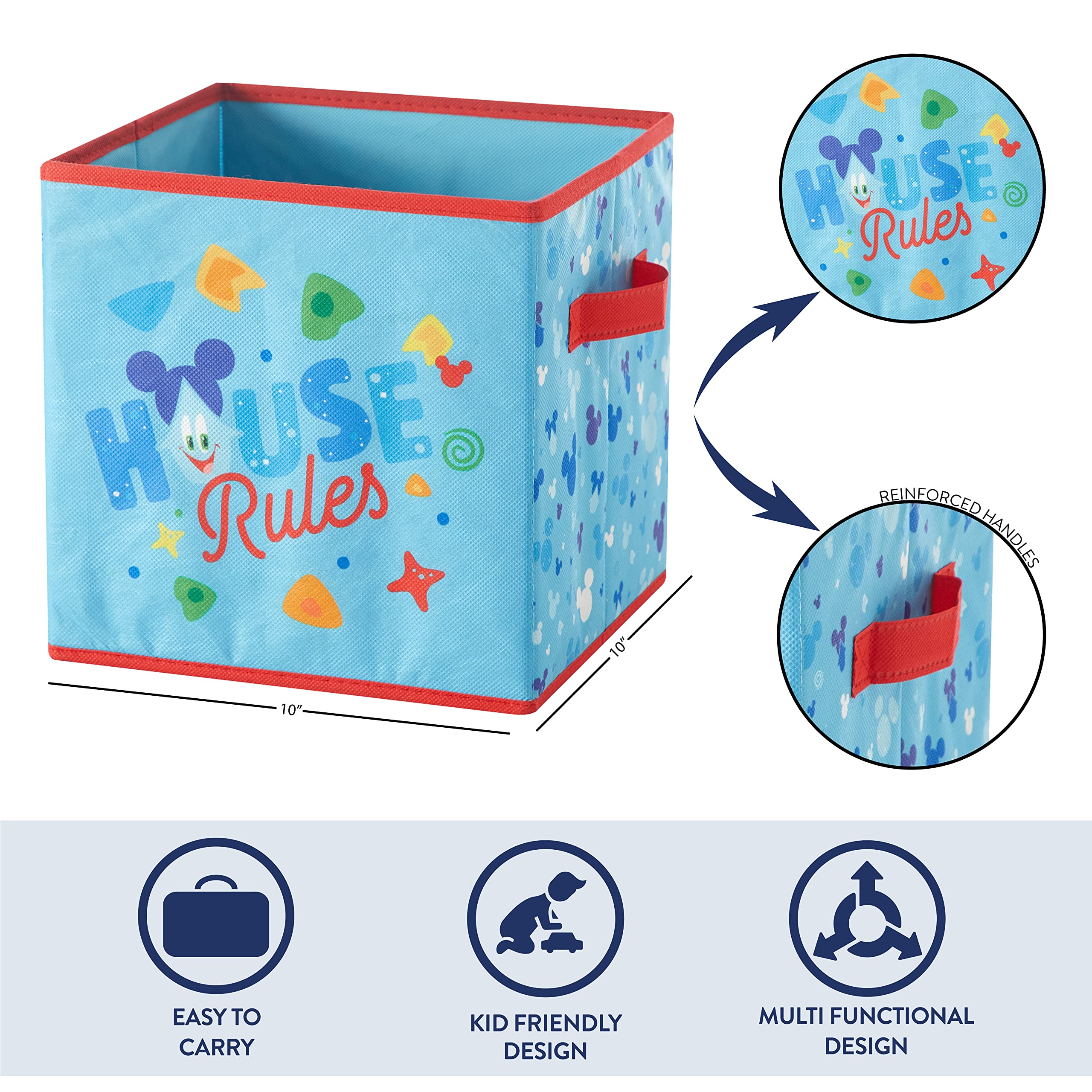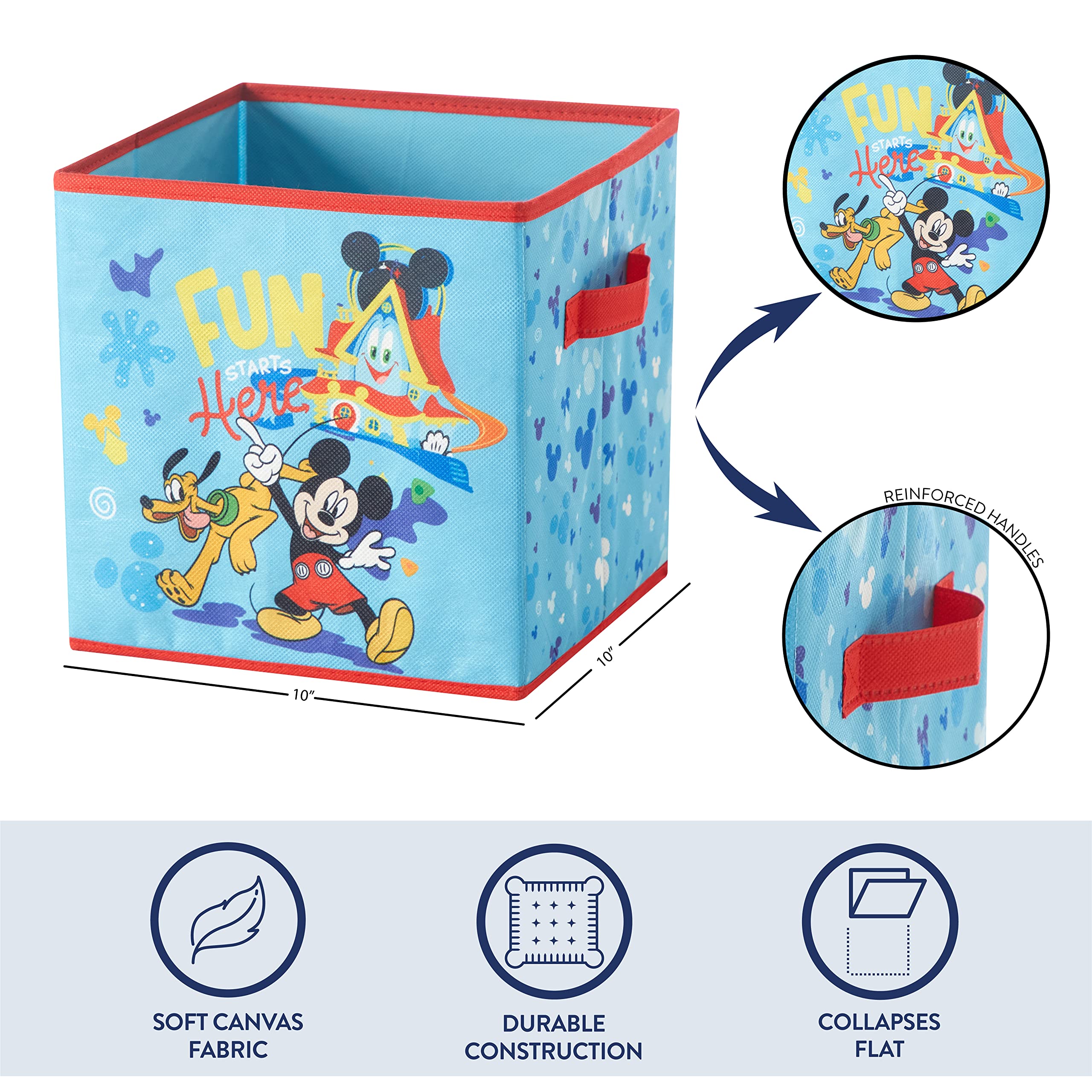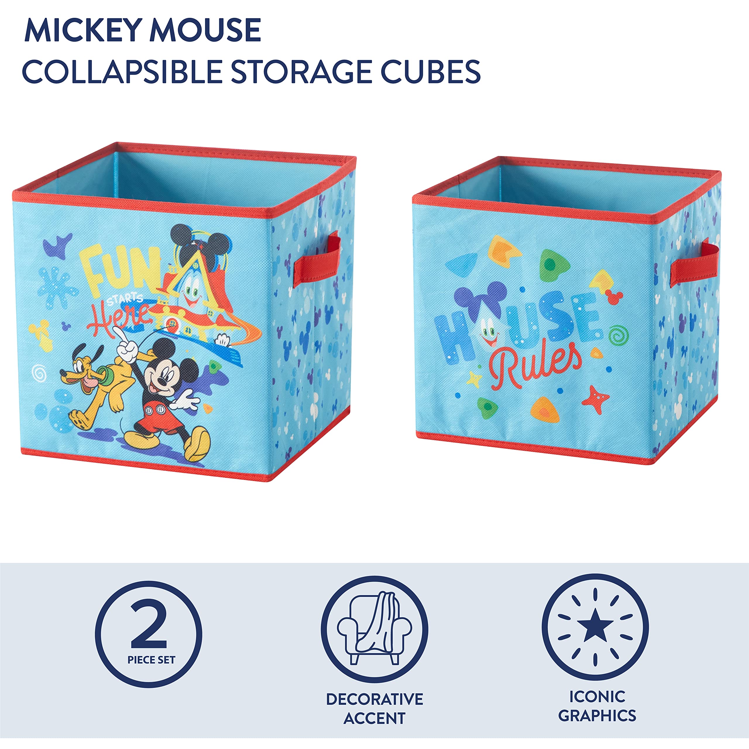 KID FRIENDLY DESIGN: This 2 pack of storage cubes features adorable graphics from Mickey Mouse. The perfect addition to your child's bedroom, closet, or playroom. The design on this cube will add a pop of color along with your child’s favorite character. The storage cubes is an easy way to maintain clutter, while adding a playful accent.