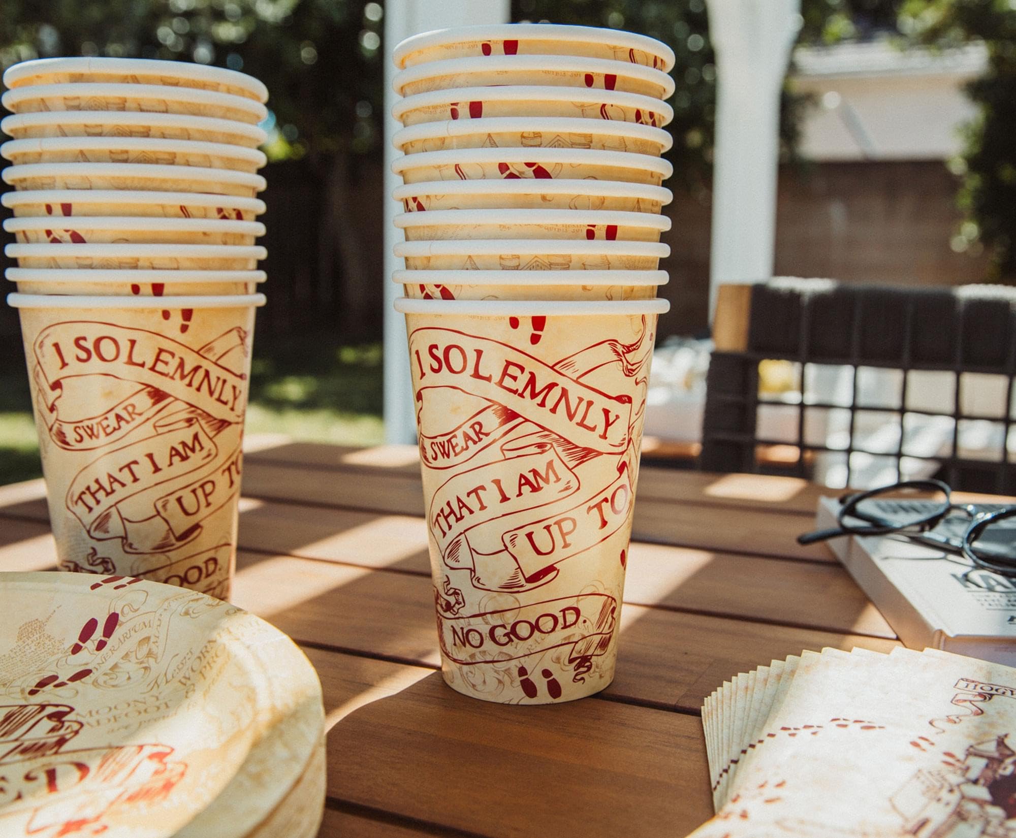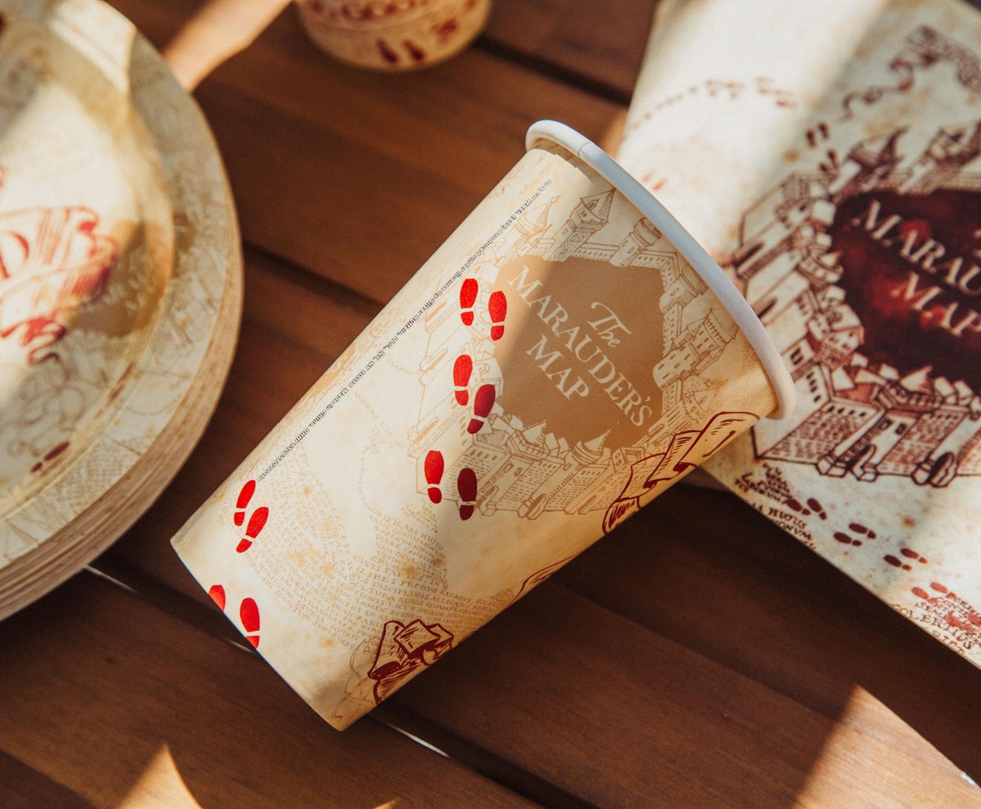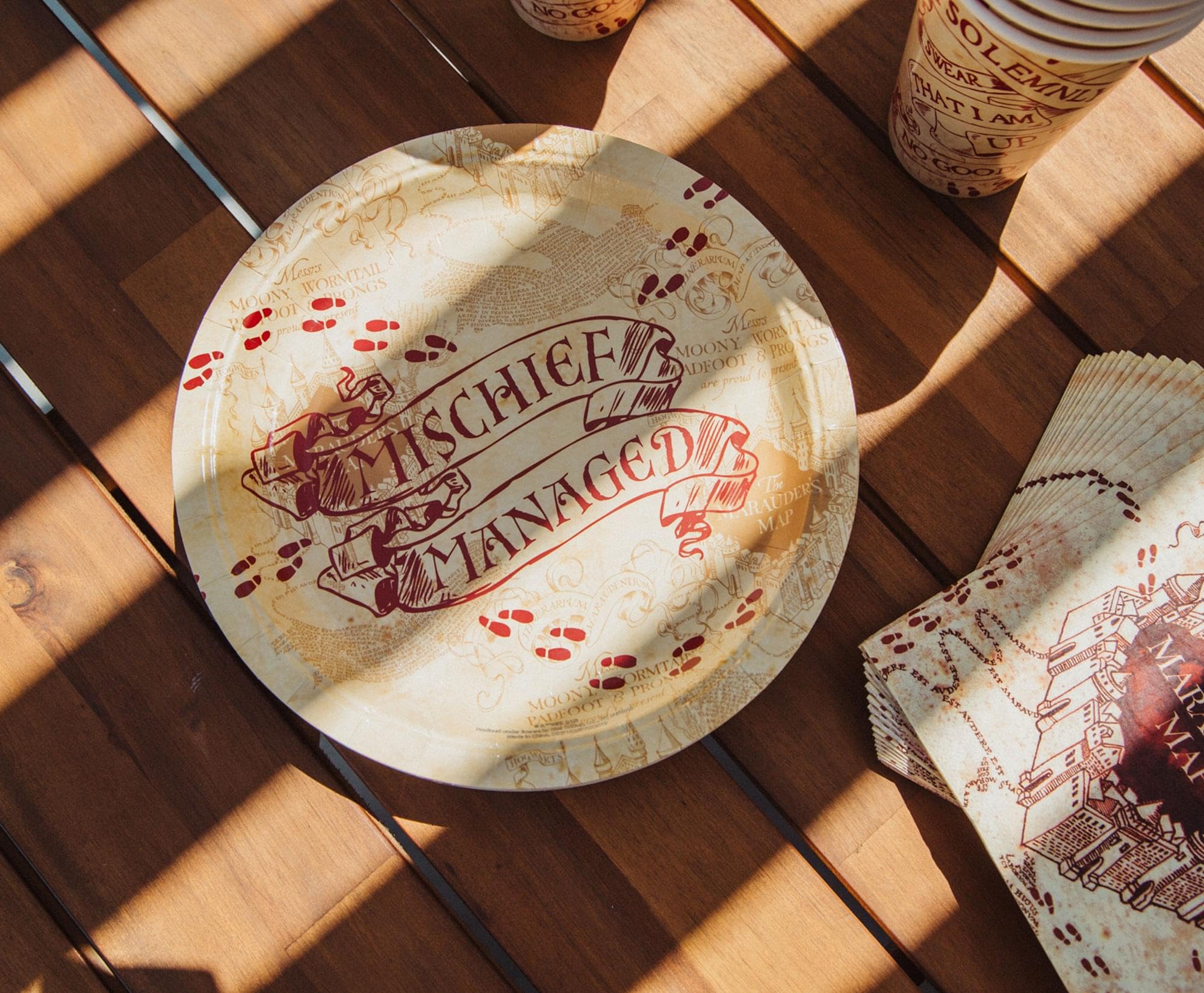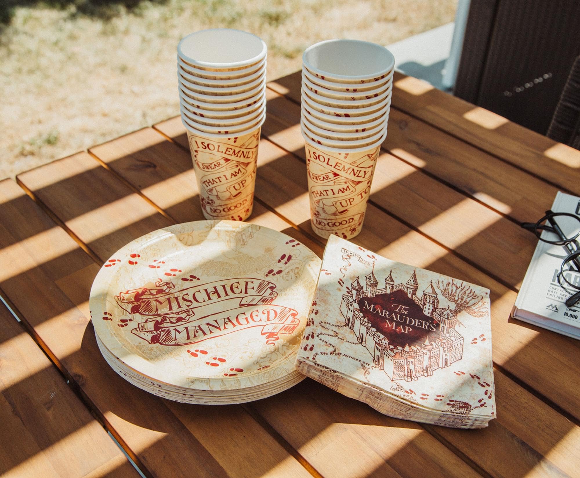TABLEWARE: Cast a spell on your next party or event with this tableware set that conjures up imagery from one of Harry Potter's most mischievous tools, the Marauder's Map. This set includes 20pc Each: 9/12” Plates, 12 3/4" x 12 3/4" Napkins, and 16oz Cups
