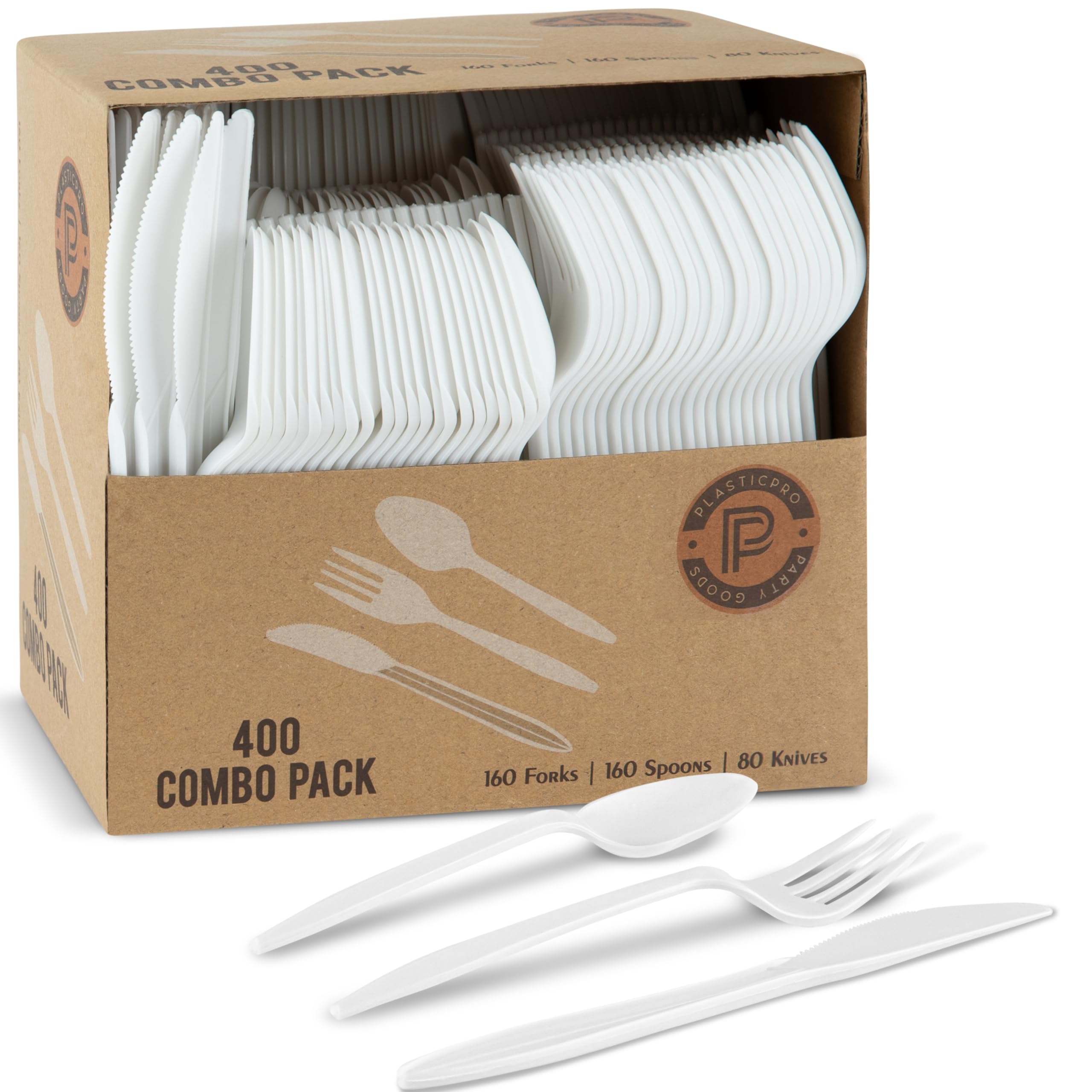 Bulk Pack disposable cutlery includes 400 pieces 160 white plastic tea spoons, 160 white plastic forks, and 80 white plastic knives.