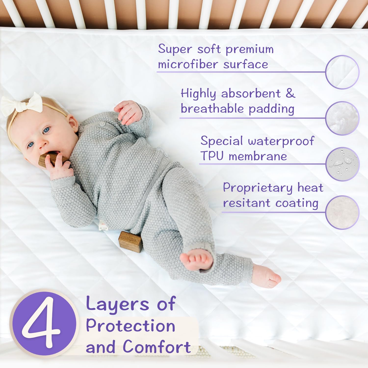 VERY ABSORBENT & FULLY WATERPROOF - Made for your baby’s sensitive skin, the soft-to-the-touch microfiber top absorbs any liquids almost instantly and the 100% waterproof lining protects your expensive crib mattress, every time! (no rips or leaks even after 380+ wash/dry cycles)
