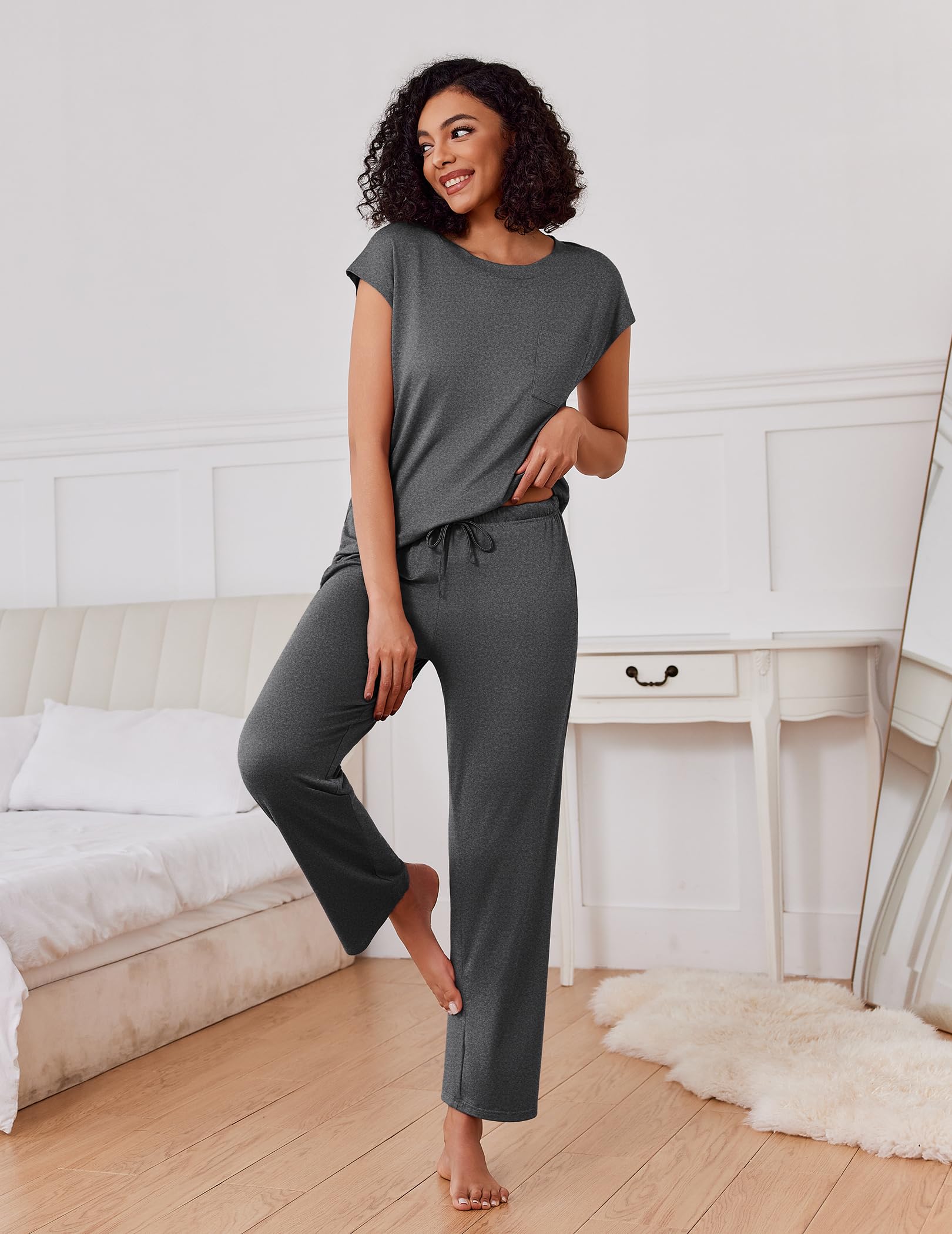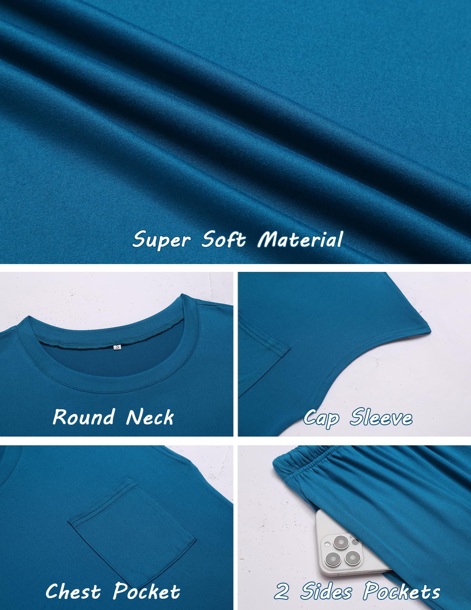 LATEST DESIGN: Top: The top of comfy pjs adopts a round neck and cap sleeve, with pockets on the chest; Pants: elastic waistband, and pockets on 2 sides can put personal belongings.