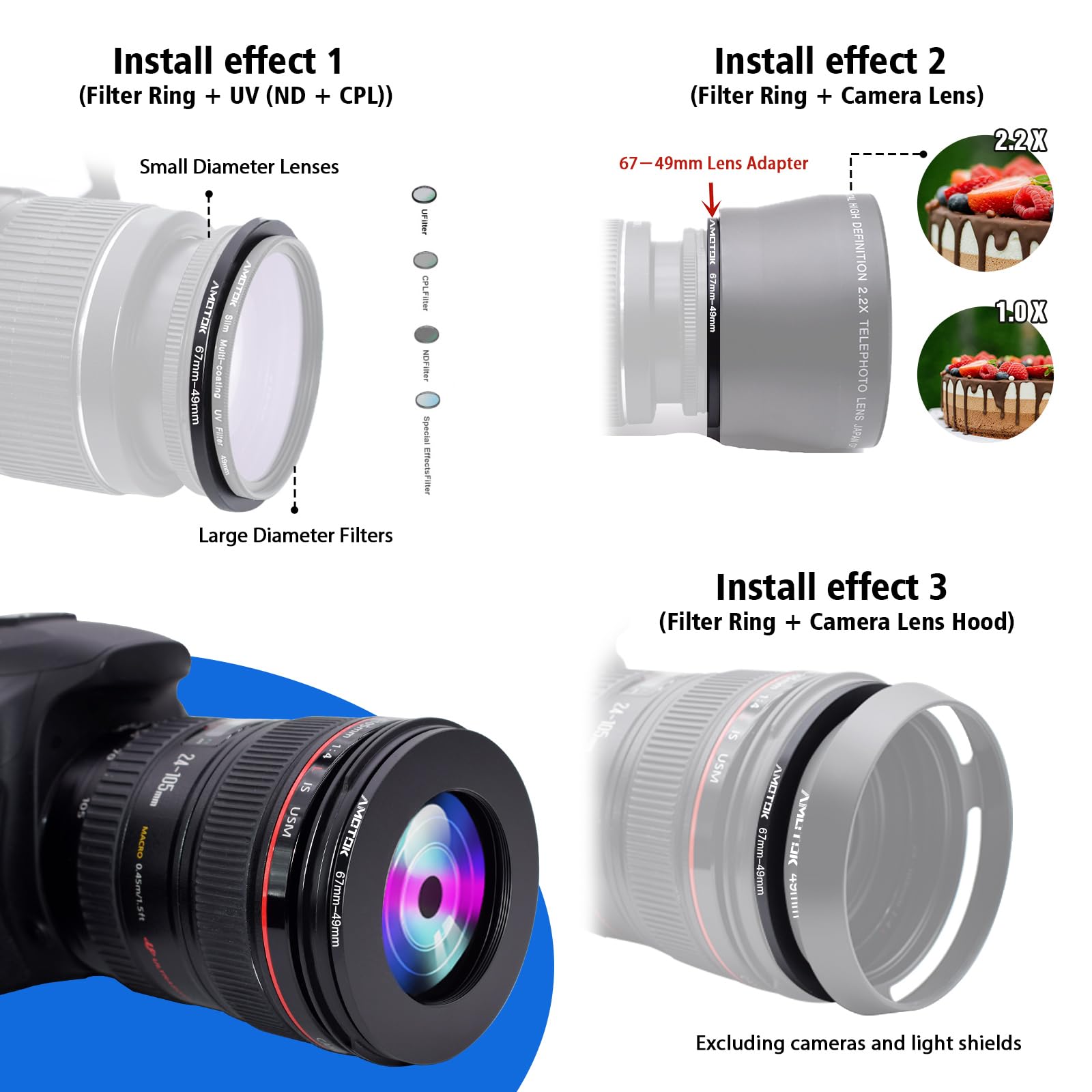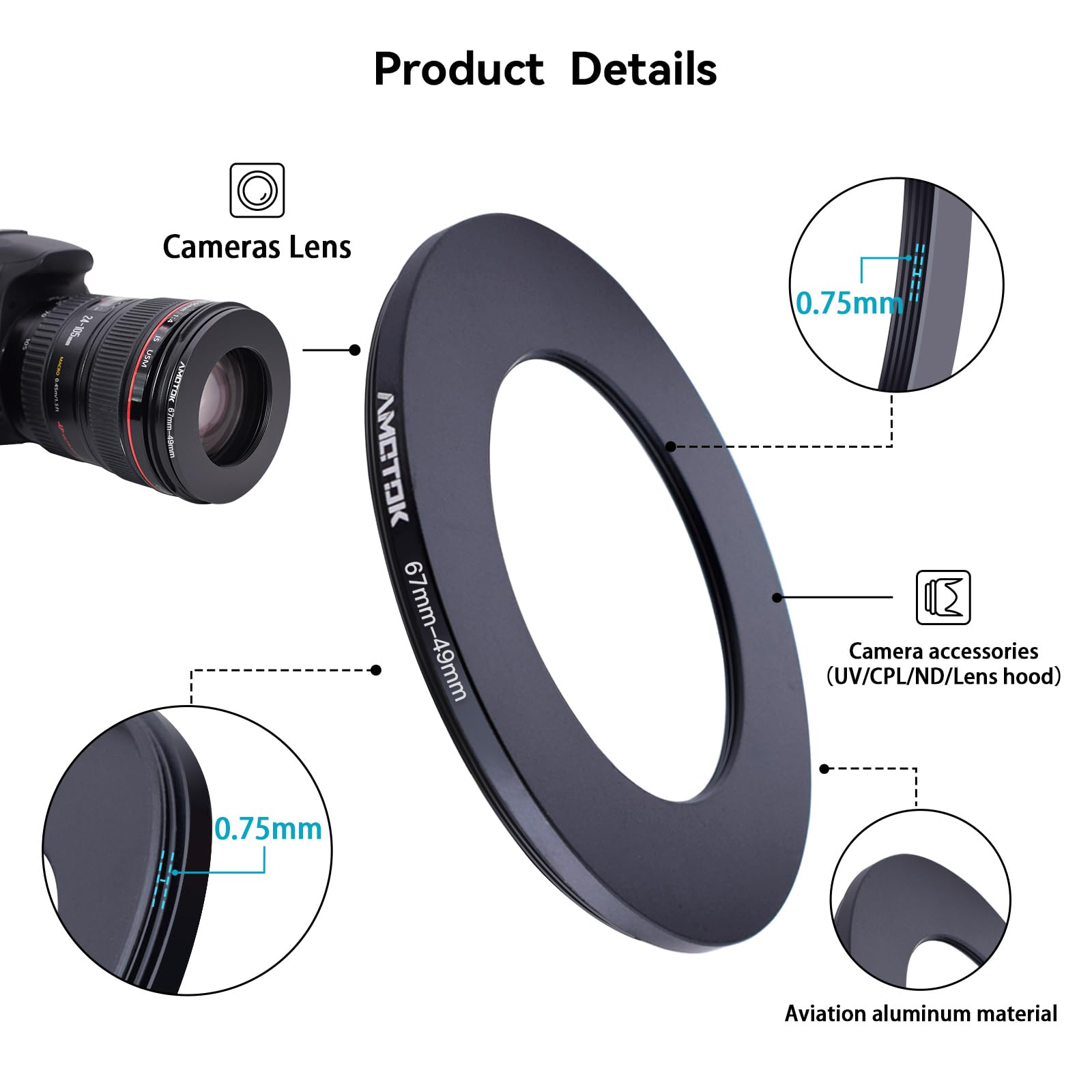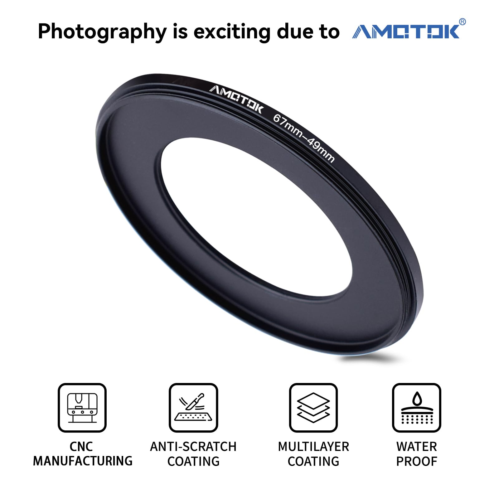 【2】AMOTOK The ring adapter easily screws onto the front of any 67mm lens,and converts the thread size of your lens to the thread size of any other 49mm accessory(such as filters,hoods,flashes and lens converters),and other 49mm accessories.