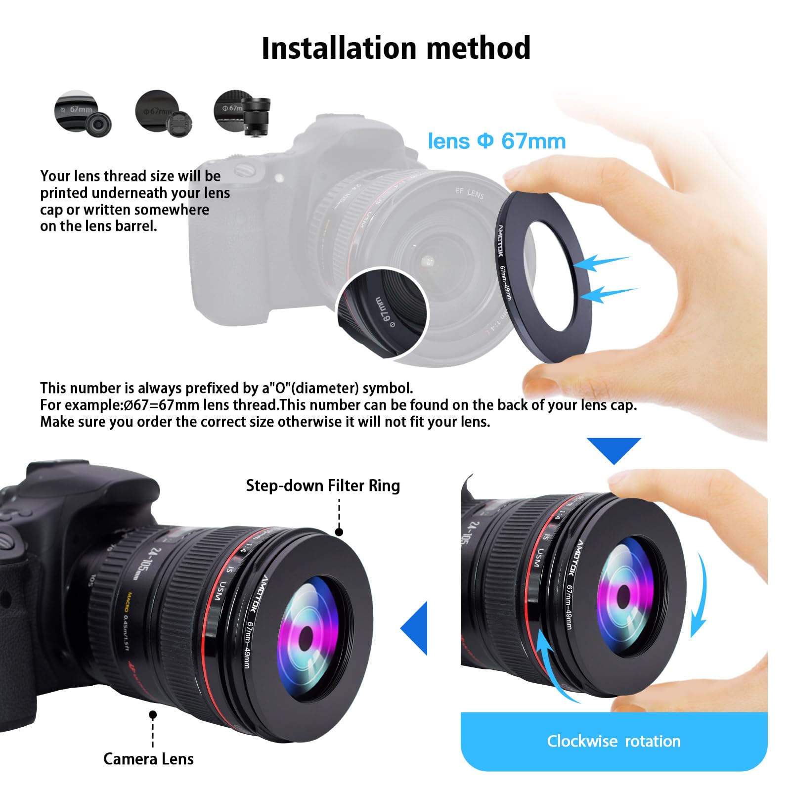【Notice】67mm lens: Make sure your Camera lens size is 67mm, and the filter size is 49mm, so choose the 67-49mm adapter ring, but not 49-67mm adapter ring.