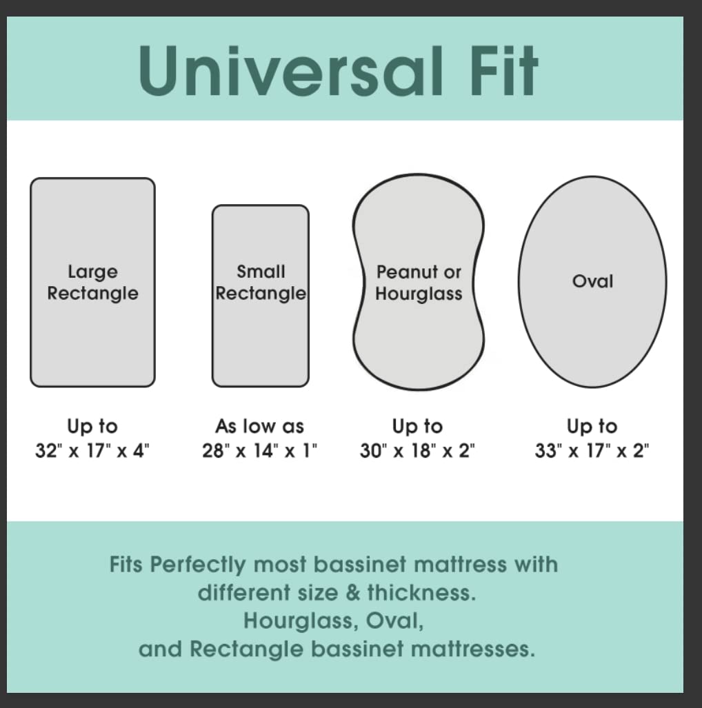 UNIVERSAL FIT BASSINET SHEETS FOR ALL CRADLE MATTRESSES:Our bassinet sheets are designed to fit all bassinet mattress pads, including oval, round, rectangle, and hourglass shapes. Whether you’re using a bedside sleeper, Moses basket, or standard bassinet, these bassinet sheets feature stretchy elastic edges for a snug, secure fit that won’t slip or bunch.