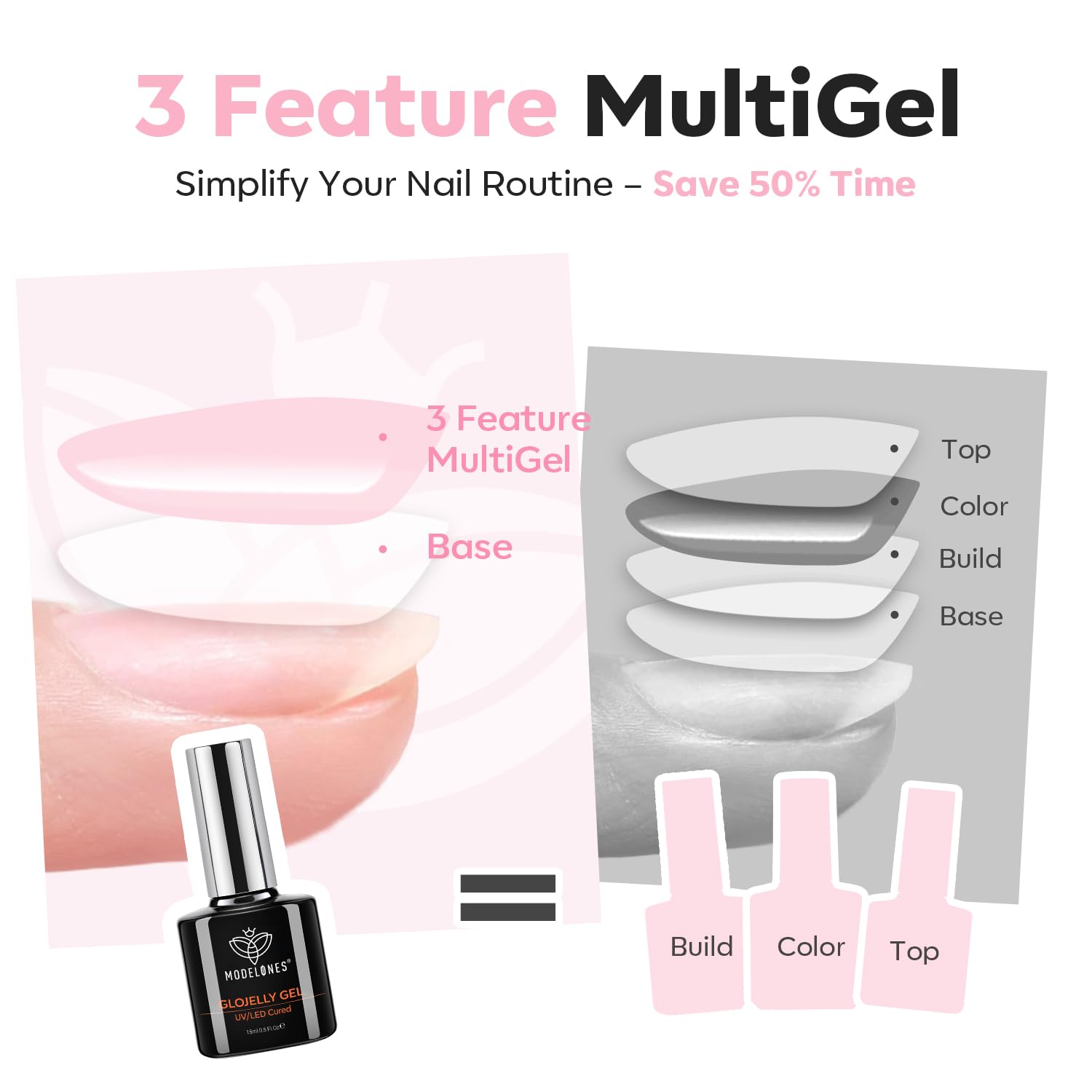 Easy Application with Self-Leveling Texture: modelones innovative pale pink building gel features balanced viscosity for smooth self-leveling control. Cures fully under nail lamp in 60-90 seconds, helps create a natural apex and even surface without flooding cuticles—great for beginners and nail techs