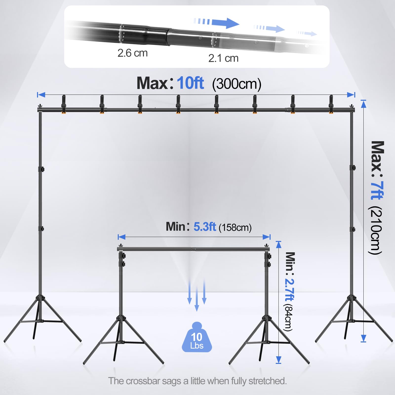 【Retractable Crossbar】The retractable design makes the crossbar more flexible in use. Users can adjust to the appropriate width (5.3ft/1.58m–10ft/3m) as required to adapt to different sizes of background backdrop.For a good decorative effect, it is best not to hang objects over 10lbs
