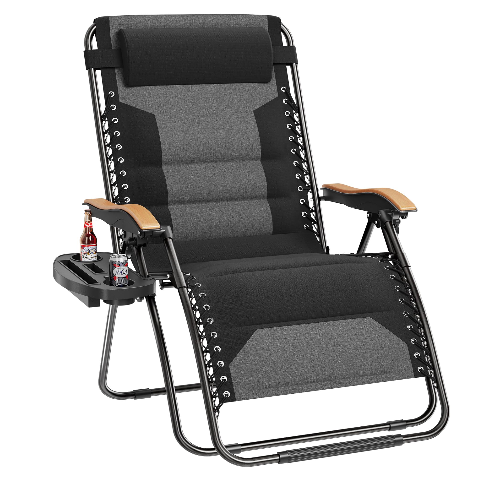 Padded Seat & Back: Fully padded seat suspended by double bungee system provides more comfort and durability. Extra-large wood-like pattern armrest provide more comfort. Cup tray is included for holding drinks or food