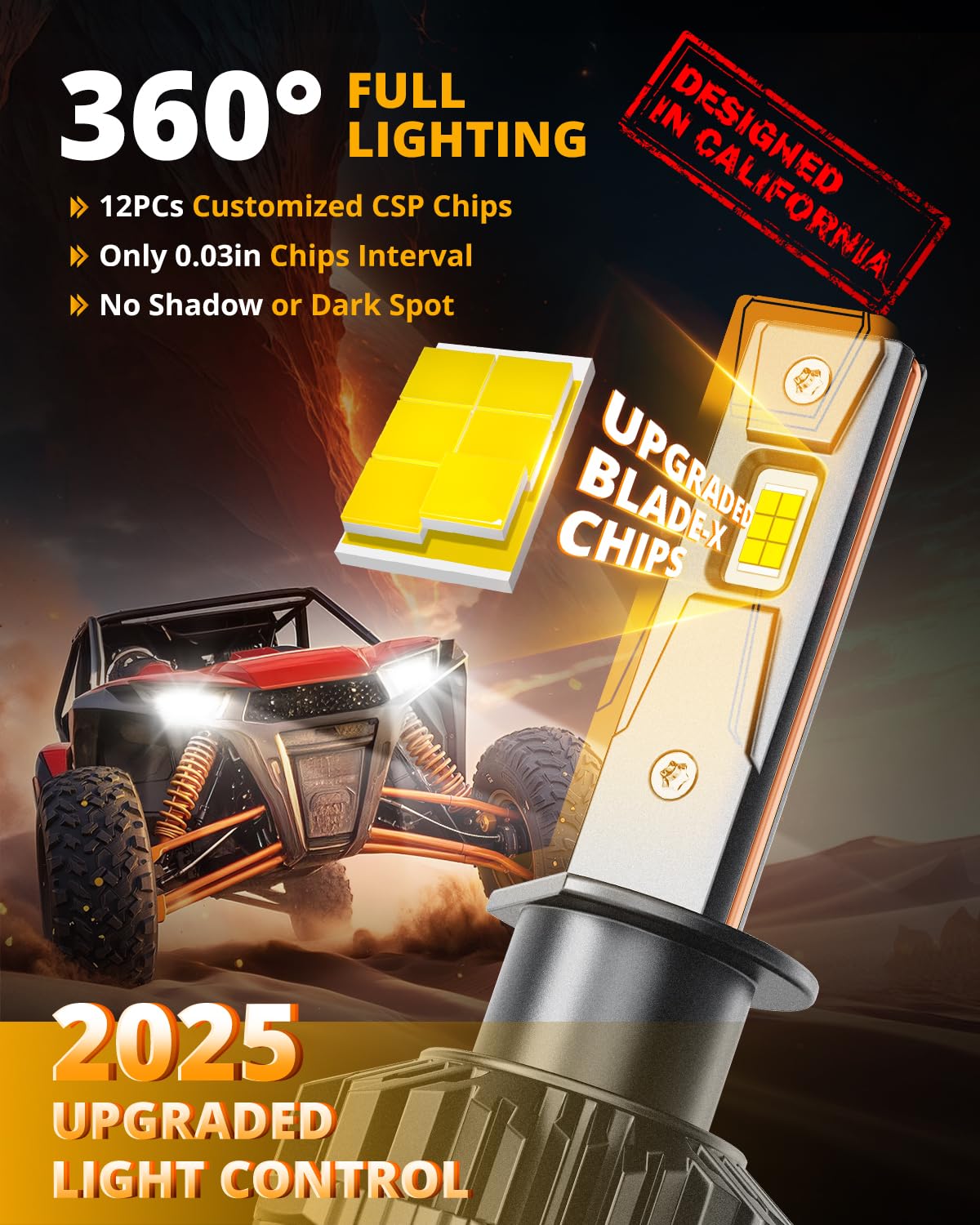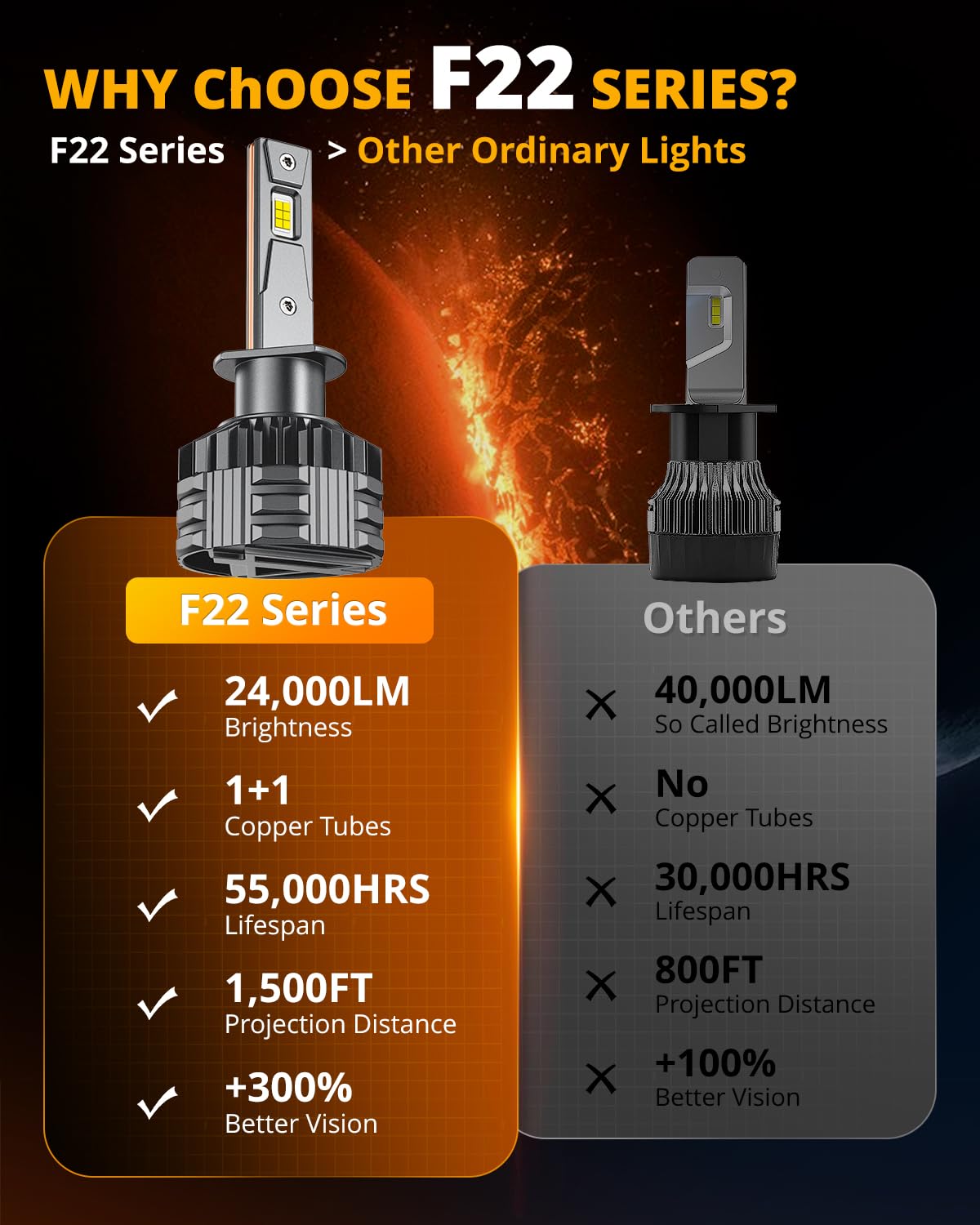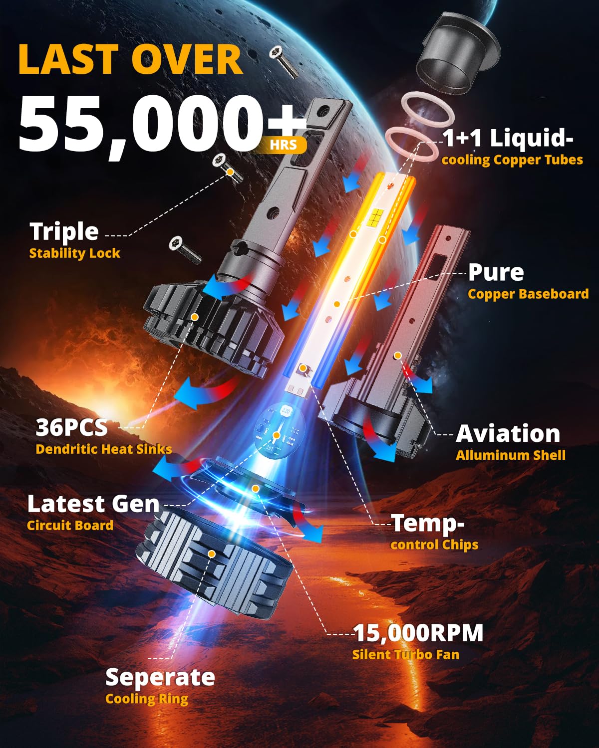 MOST ADVANCED COOLING SYSTEM EVER: Five-layer cooling design - The red copper substrates + 6063 aviation aluminum lamp body + Unique 36PCs dendritic heat sinks + Latest double liquid-cooling copper tubes + 15,000RPM turbofan directly doubles heat dissipation, prolonging lifespan of H1 light up to 55,000 hours to avoid frequent replacements.
