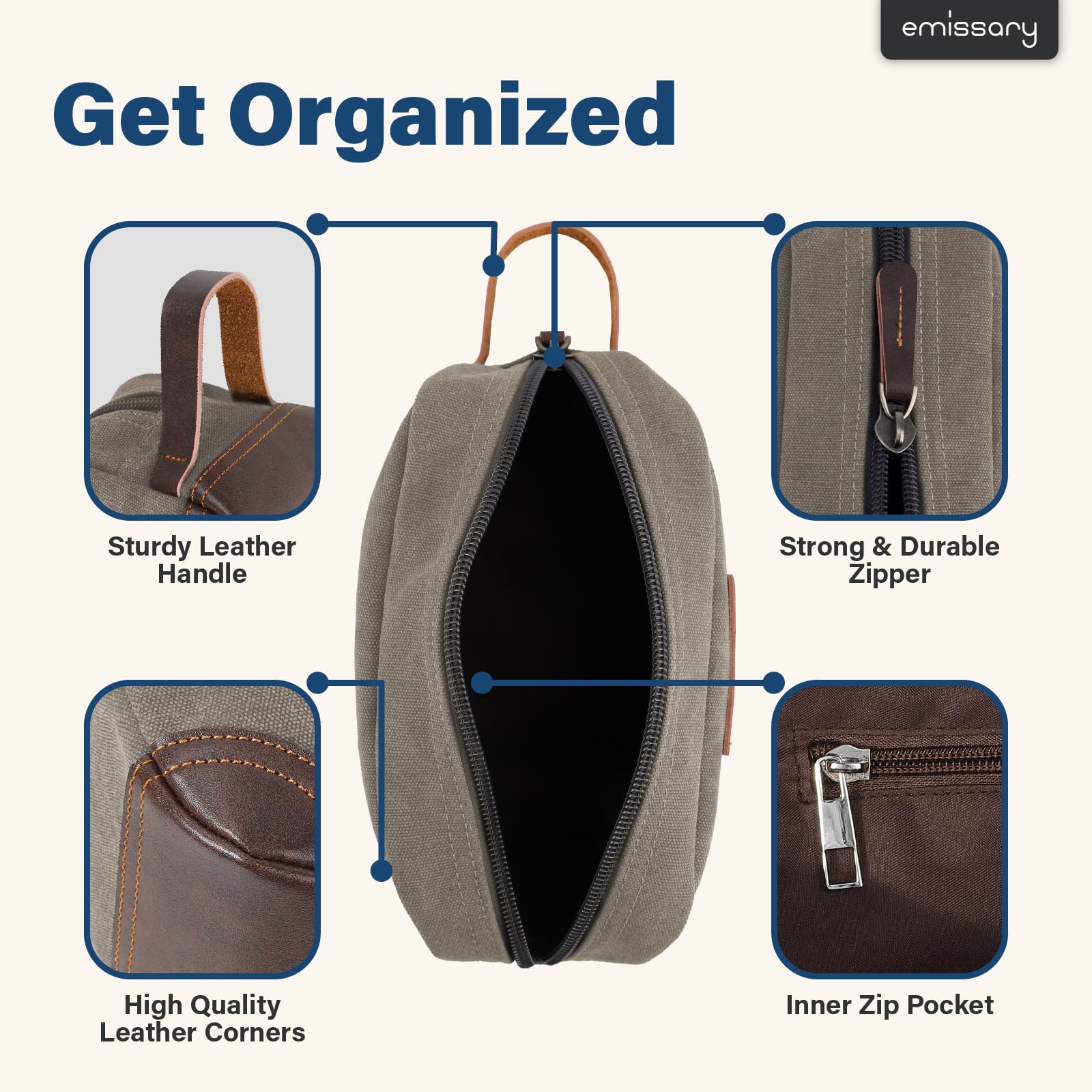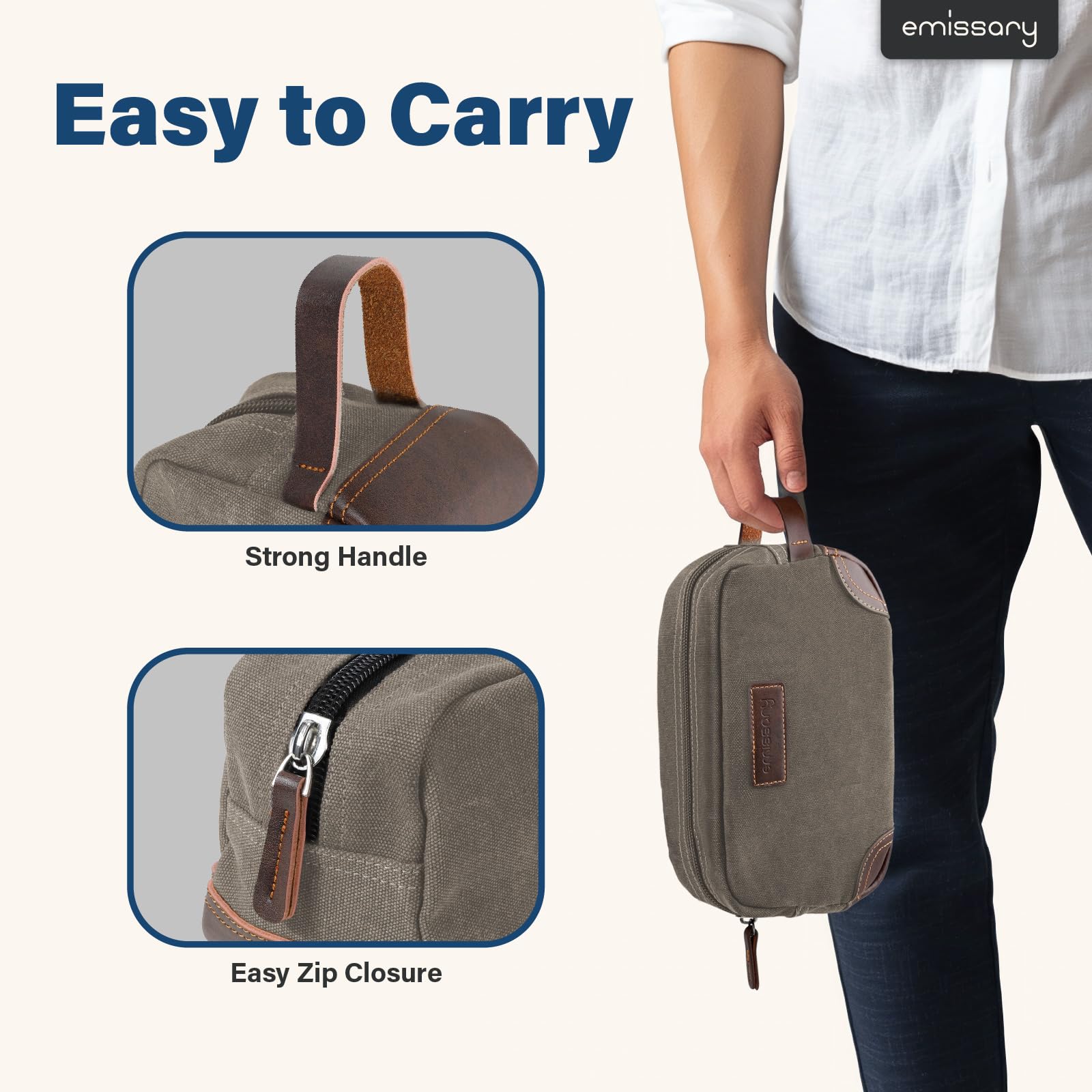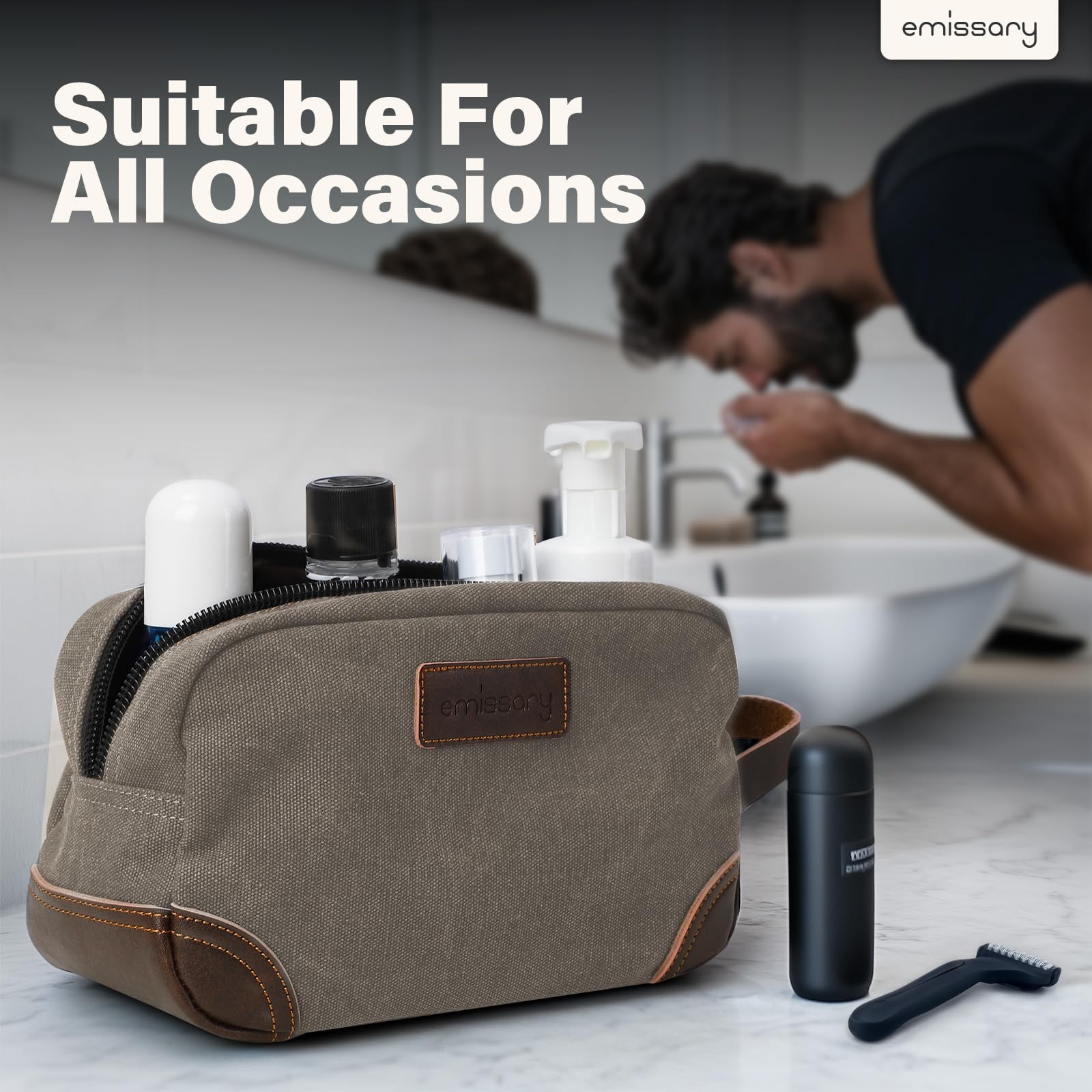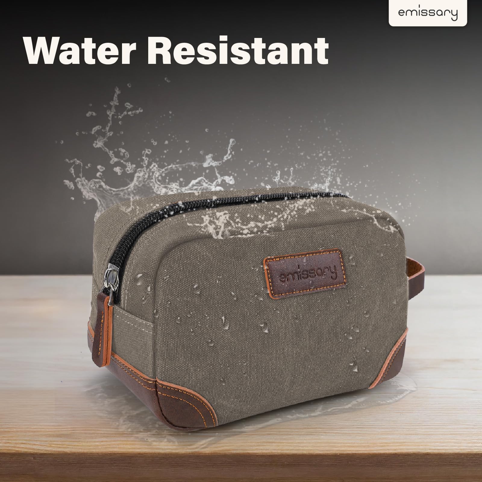 HIGH-QUALITY DURABLE MATERIAL: This exceptional toiletry travel bag by emissary is made of canvas and PU leather, which is known for its lightweight yet durable qualities, the perfect combination for traveling. This specific material is water resistant, making it safe for use in environments where it may become wet. Making this the perfect bathroom bag, shaving bag, and travel dopp kit.