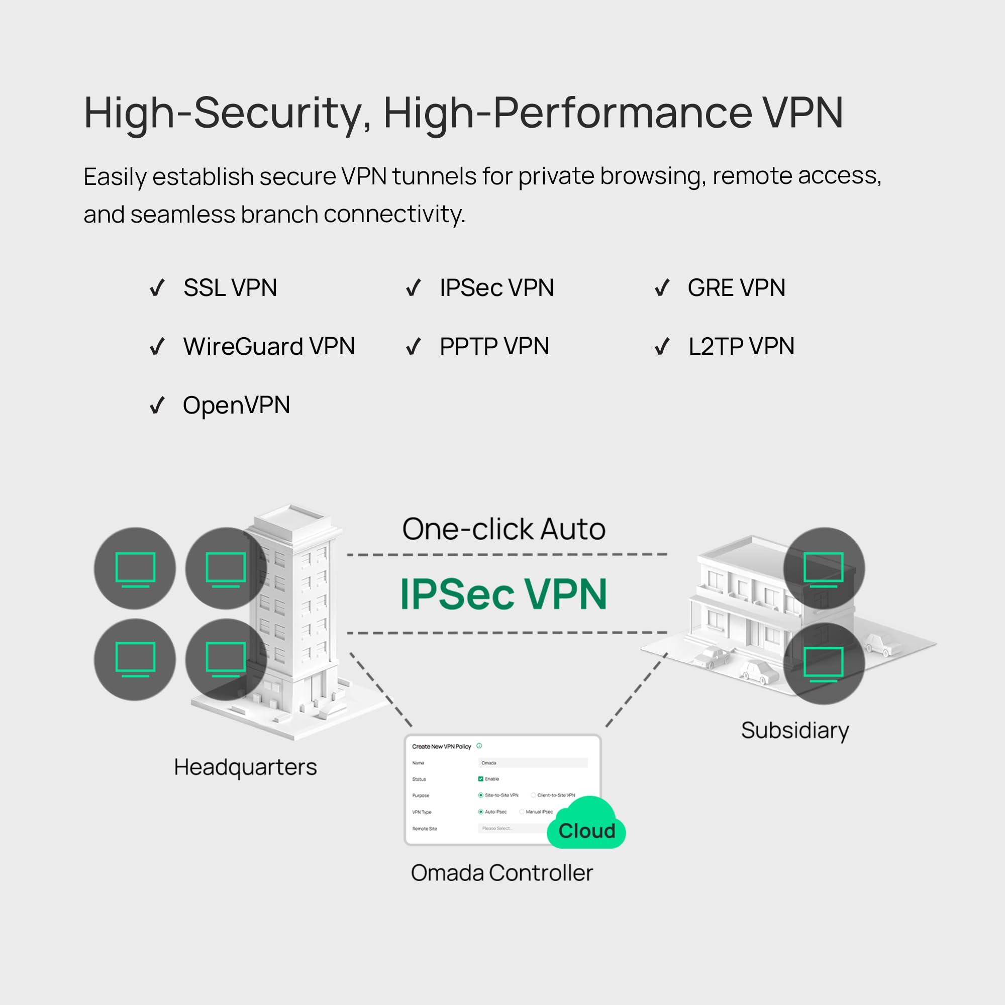 【Highly Secure VPN】Supports up to 100× LAN-to-LAN IPsec, 66× OpenVPN, 60× L2TP, and 60× PPTP VPN connections.