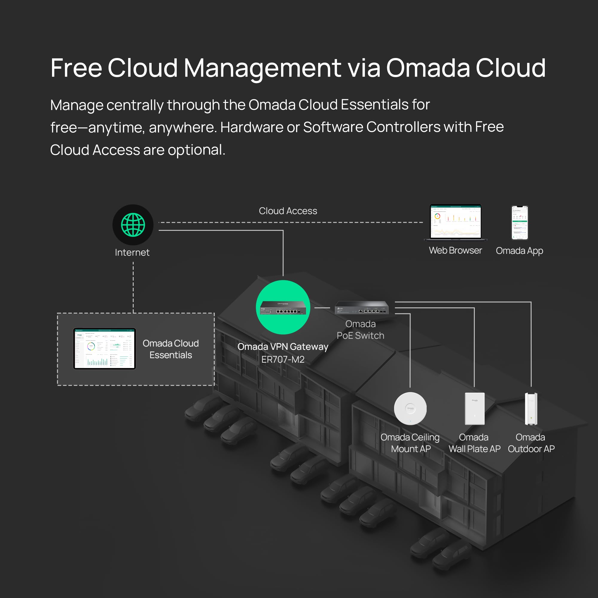 【Cloud Access】Remote Cloud access and Omada app brings centralized cloud management of the whole network from different sites—all controlled from a single interface anywhere, anytime.