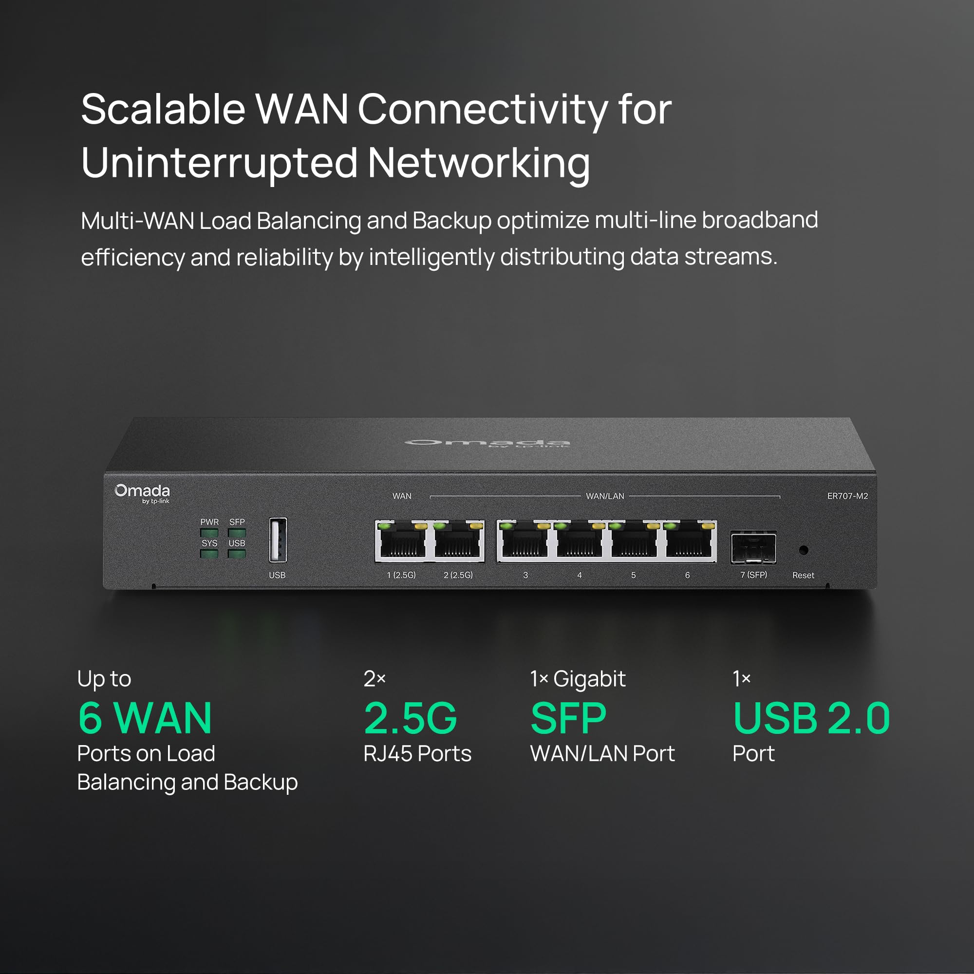 Omada Multi-Gigabit VPN Router (ER707-M2) with 1× 2.5G RJ45 WAN Port, 1× 2.5G RJ45 WAN/LAN Port, 1× Gigabit SFP WAN/LAN Port, 4× Gigabit RJ45 WAN/LAN Ports, 1× USB 2.0 port Integration with Omada SDN Controller, Support SSL VPN, OpenVPN and IPsec/ PPTP/ L2TP/ L2TP over IPSec VPN, 500,000 Concurrent Sessions, Load Balance, Link Backup, 4G LTE Backup with USB Dongle, Policy-based Firewall, Static Routing, Policy Routing, Multi-net DHCP, Guest Portal, VLAN