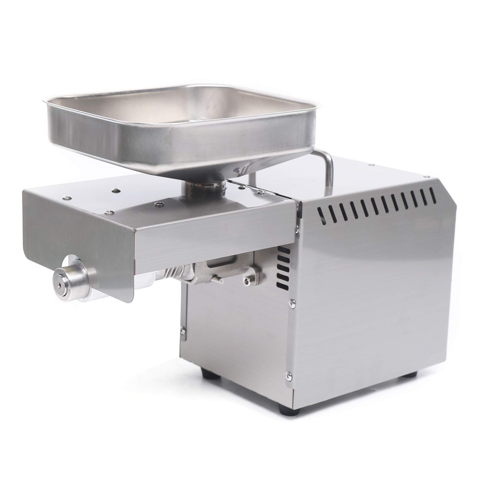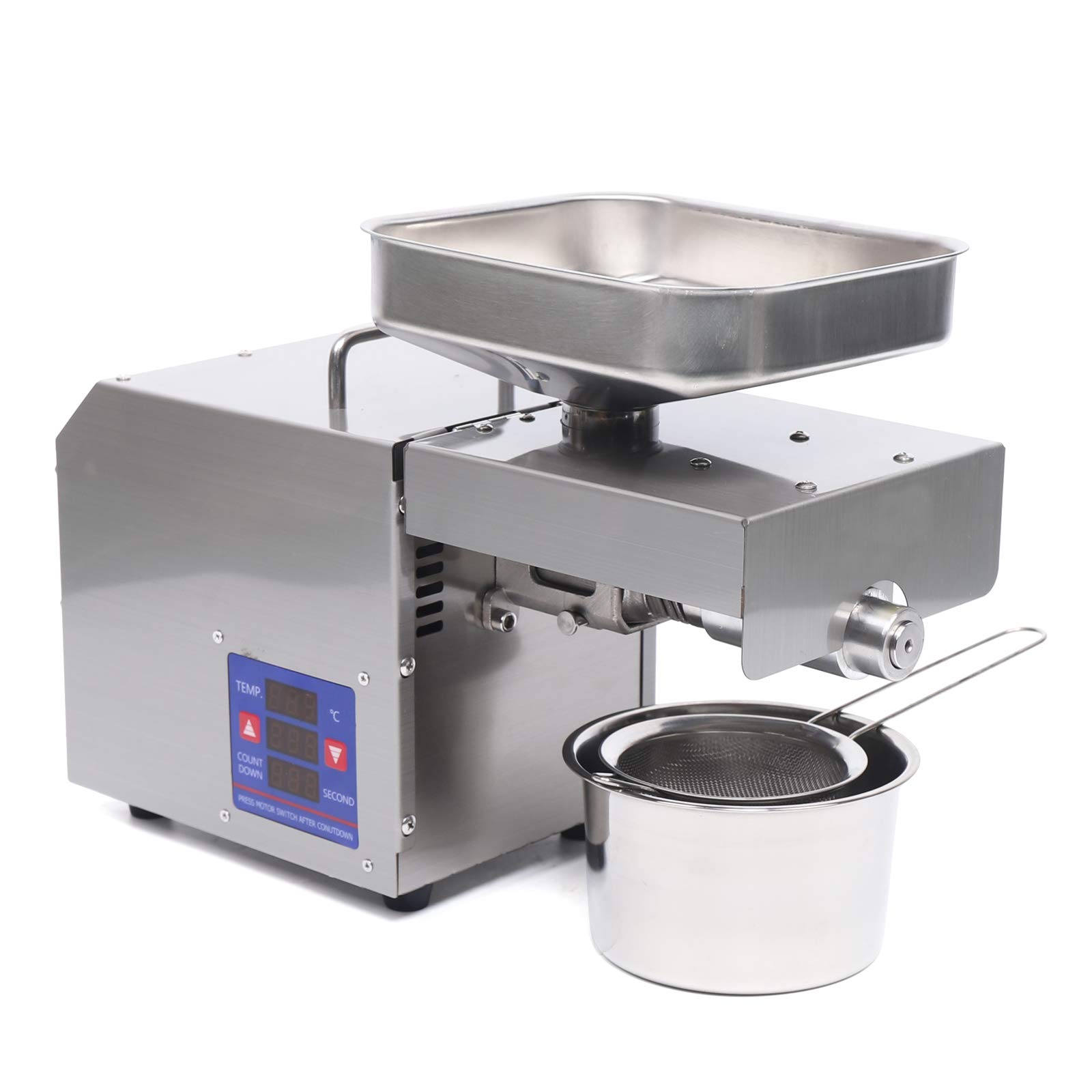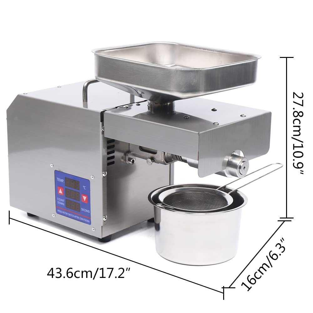 Description The automatic oil press machine is widely used for home and business oil extraction. It can be used for various raw materials such as peanuts, soybeans, rapeseed, walnuts, sesame,sunflower seeds, almonds, corn, etc.Especially when you use it to press the peanuts, it has clearer oil output and higher oil output. Specification Name:Oil press machine Voltage:110V Material:304 stainless steel Maximum power:600W Size: (L*W*H)43.6*16*27.8cm/17.2”*6.3”*10.9” Package dimensions:53*28*35cm Package weight:10.7KG Net Weight: 10KG Technical Support Oiled oil residue can also be used as a gourmet cooking After working in the high temperature mode, remove the machine and wear high temperature gloves. It is not suitable for olive oil. Shipping List 1PCS Host 1PCS Oil Cup 1PCS Filter 1PCS Insulation gloves 1PCS Instruction manual