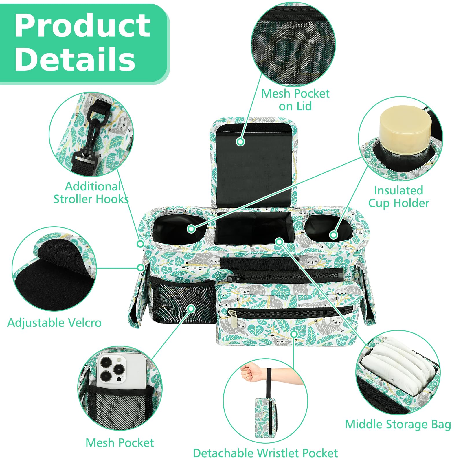 Multi Structure: This stroller storage organizer equipped with multifunctional structure: Insulated cup holders on both sides to place baby bottles and drink cups; The middle storage compartment can accommodate baby diapers, wipes, pacifiers, teething toys and other accessories; Equipped with a detachable and portable small bag, it is convenient for mothers to store important items such as cell phones, wallet etc.