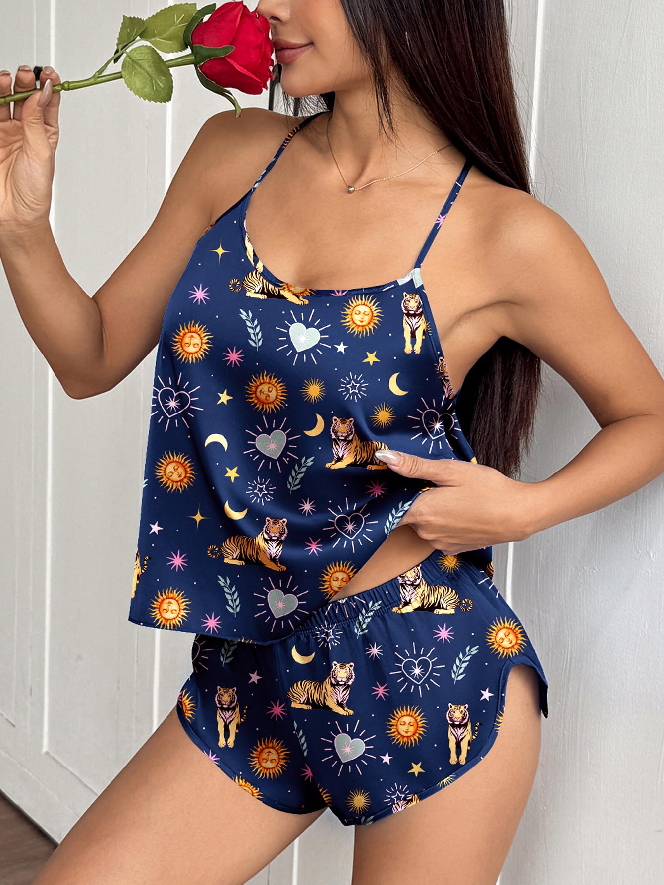 SATIN CAMI PAJAMA SET FOR WOMEN: Playful Print Silk pajamas for women - 95% polyester/5% spandex satin cami set with silky texture. Breathable, soft-stretch, wrinkle-resistant & easy-care for year-round sleep & comfy loungewear