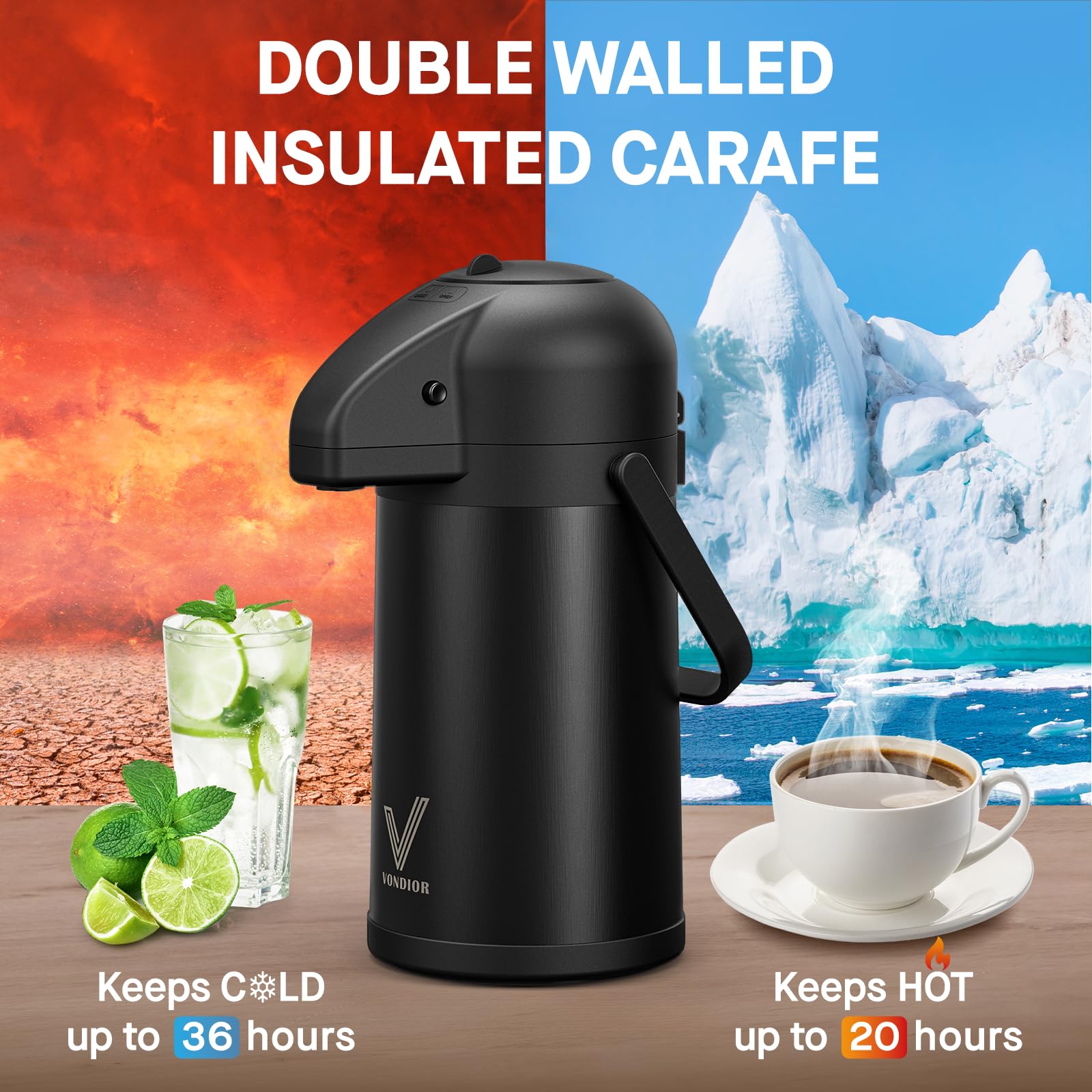 KEEP BEVERAGES HOT OR COLD FOR 20 HOURS: Vondior double-walled coffee carafe, which utilizes laboratory-tested vacuum insulation technology, ensures that hot beverages stay warm for up to 20 hours and cold beverages stay chilled for up to 24 hours. You can rely on this thermal coffee pot to maintain the optimal temperature of your drinks.
