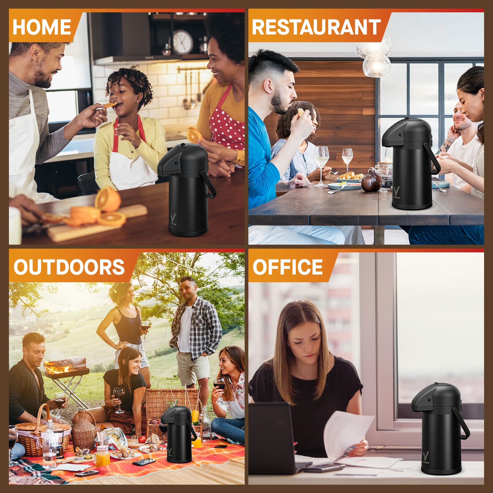 DISPENSES EASILY AND QUICKLY: With the pump-action top design, this coffee dispenser with pump allows you to dispense your favorite beverage easily and safely with one press without lifting and tilting the entire airport, which greatly prevents the drinks from being overturned or leaked, and friendly to the elder and children.