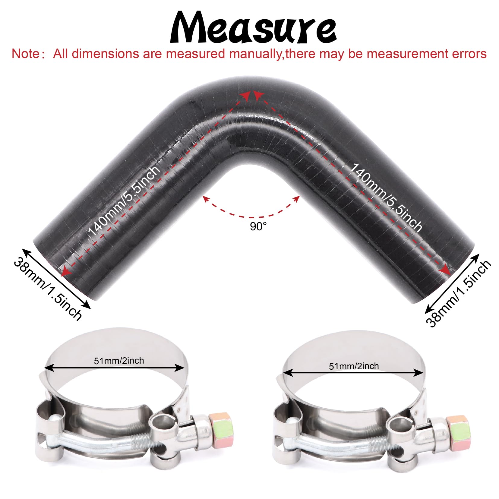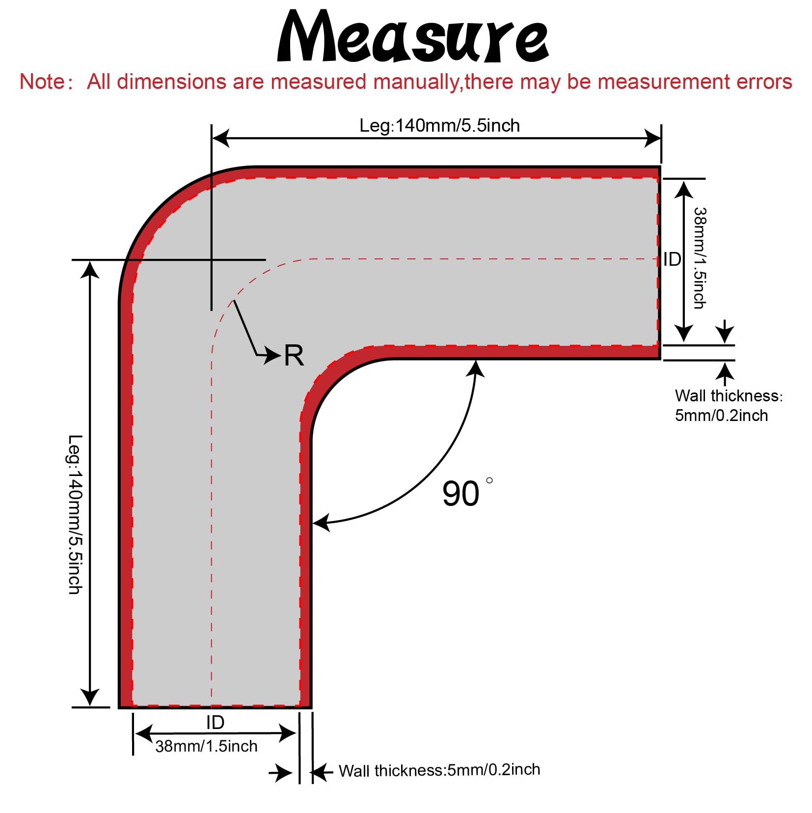 Silicone 4-Ply 90 degree silicone hose, Inner Diameter: 1.5"(38mm). Length: 102mm one leg. Thickness: 5mm. Size tolerance: +/- 0.5MM.