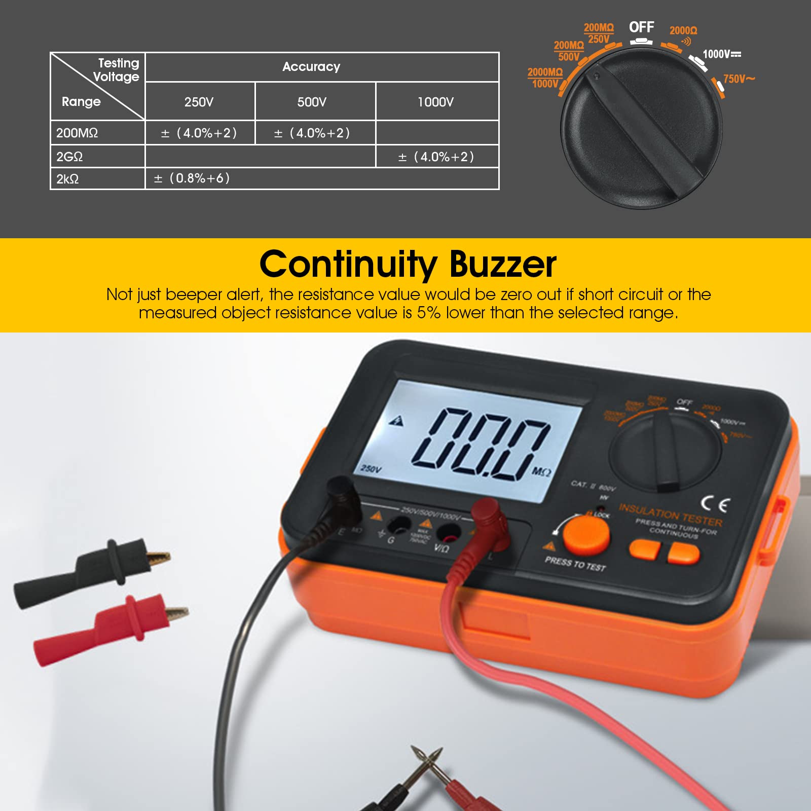 ✅【Digital Multi Tester】Not just an mega meter , but also an electrical multimeter with 1999 counts display, which can measure AC voltage up to 750V with ±1.0% accuracy, test DC voltage up to 1000V with ±0.5% accuracy and troubleshoot continuity with buzzer.
