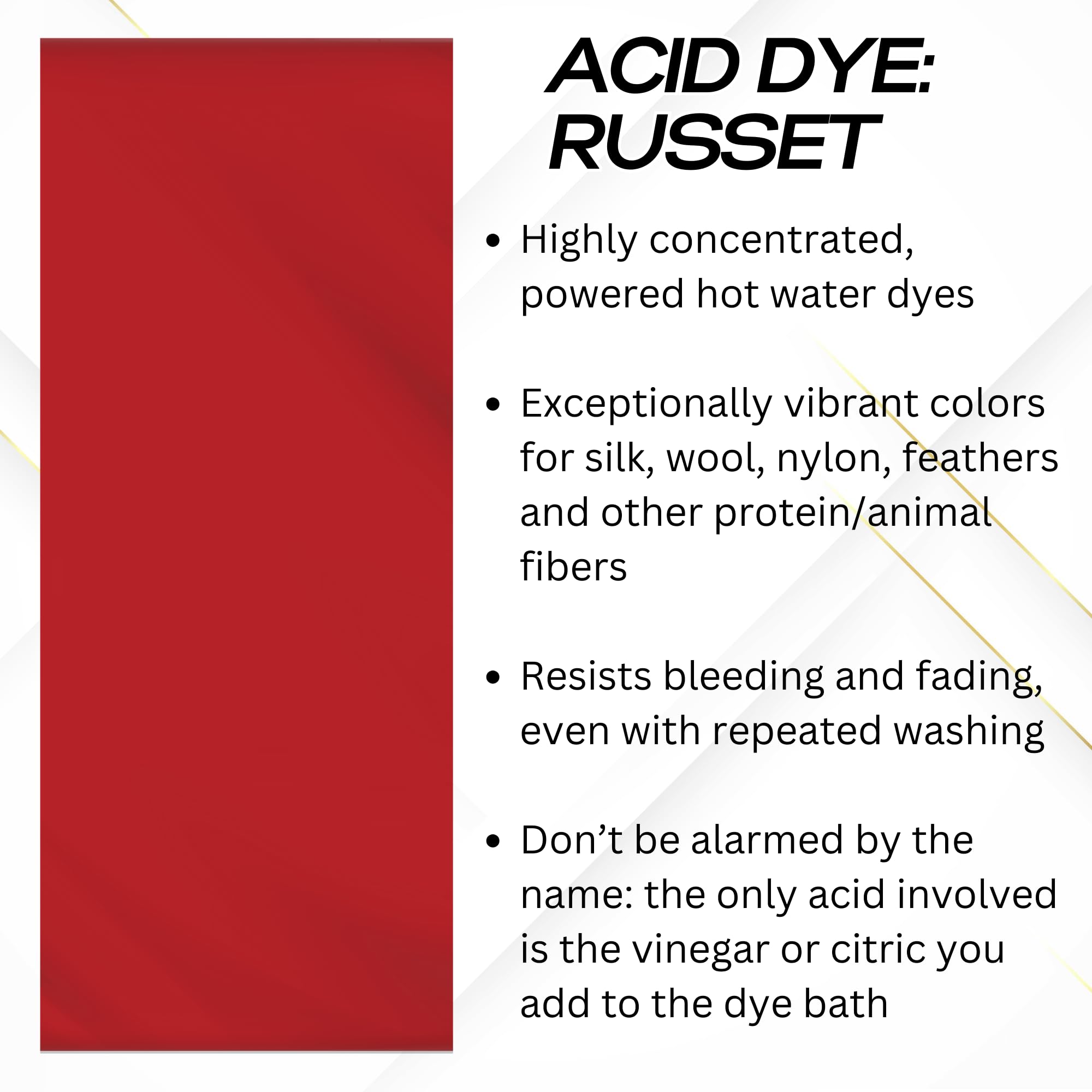 Easy to Use - Heat the water to 180 degrees F (80 degrees C) then add the dye. Add wet fabric to the dye mixture, then add chosen acid (vinegar or citric acid). Acid Dyes are stable in solution, allowing you to save the dye bath or stock solution for future use