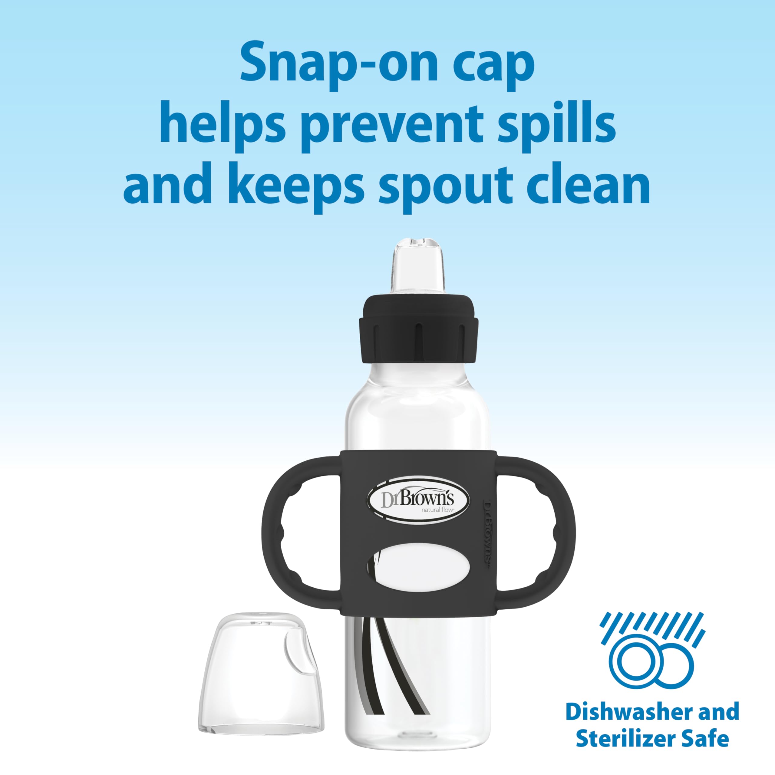 Dr. Brown's Milestones Narrow Sippy Spout Bottle is the easy way to help baby develop new drinking skills! Introducing a sippy spout has never been simpler. The soft silicone sippy spout is used in place of the nipple on the Dr. Brown’s Narrow Bottle that’s already familiar to baby. Easy grip 100% silicone handles are removable and fit most narrow bottles and sippy cups, while the snap-on cap keeps the spout clean when on-the-go. The soft sippy spout fits any Dr. Brown’s Options+ Narrow Bottle after the internal vent is removed. All parts are dishwasher (top rack only) and sterilizer safe. BPA-free. 6m+.