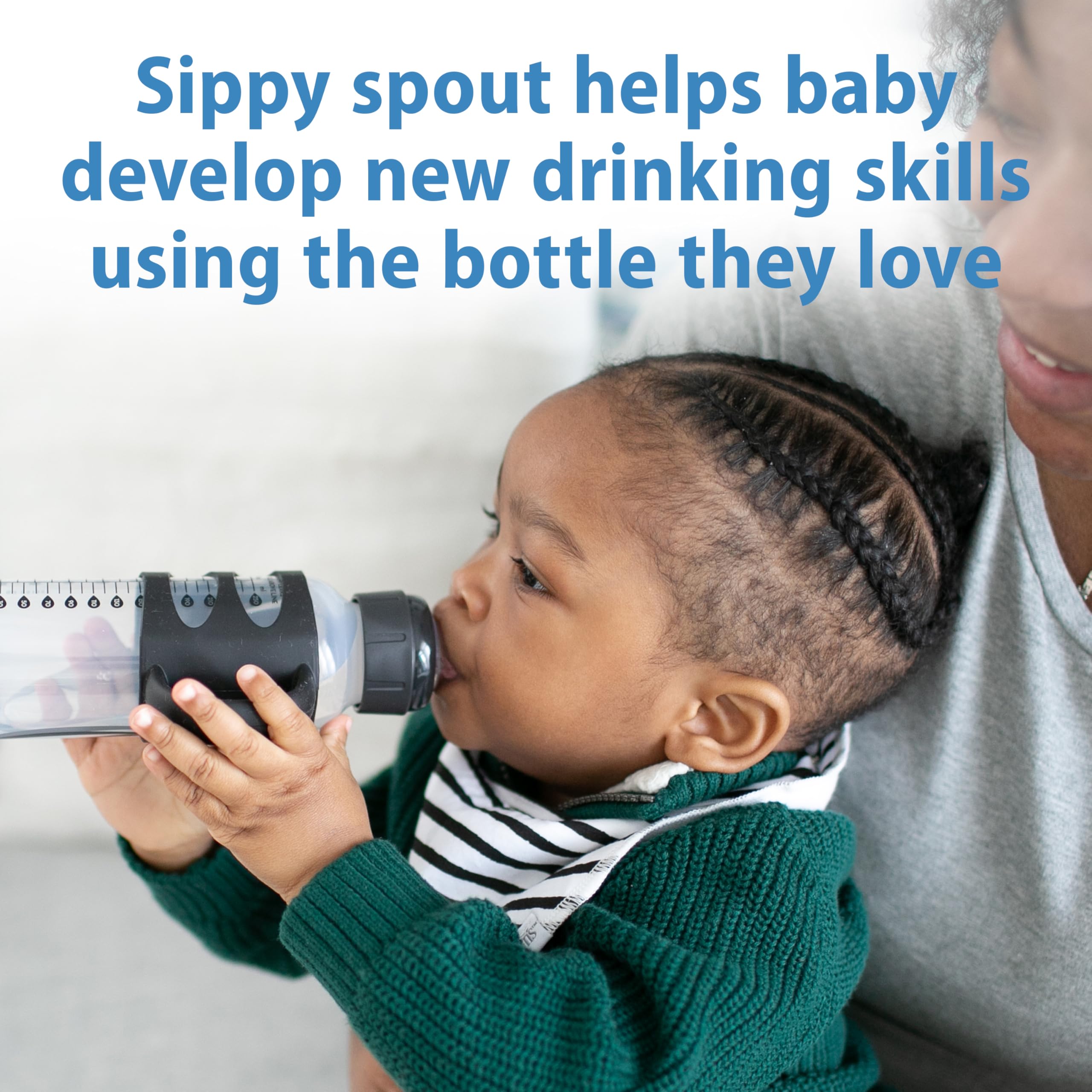 BOTTLE TO SIPPY TRANSITION. Transition from bottle nipple to soft silicone sippy spout to teach baby new drinking skills.