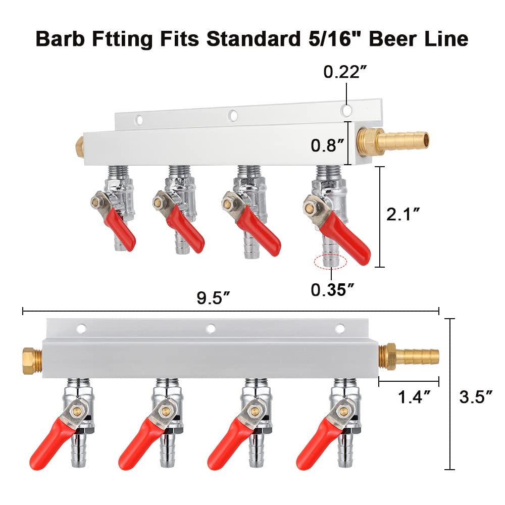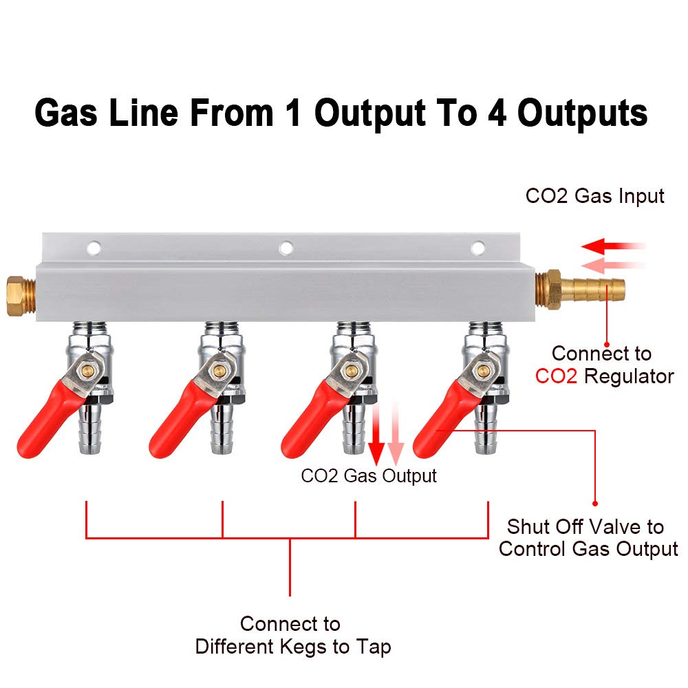 【LOW COST CONNECTING EXTENSION】The gas manifold is designed with four 5/16’’ barb fitting outputs, which allows splitting co2 gas line from 1 output to 4 outputs to brewing keg, no need of high cost multi-connection regulator!