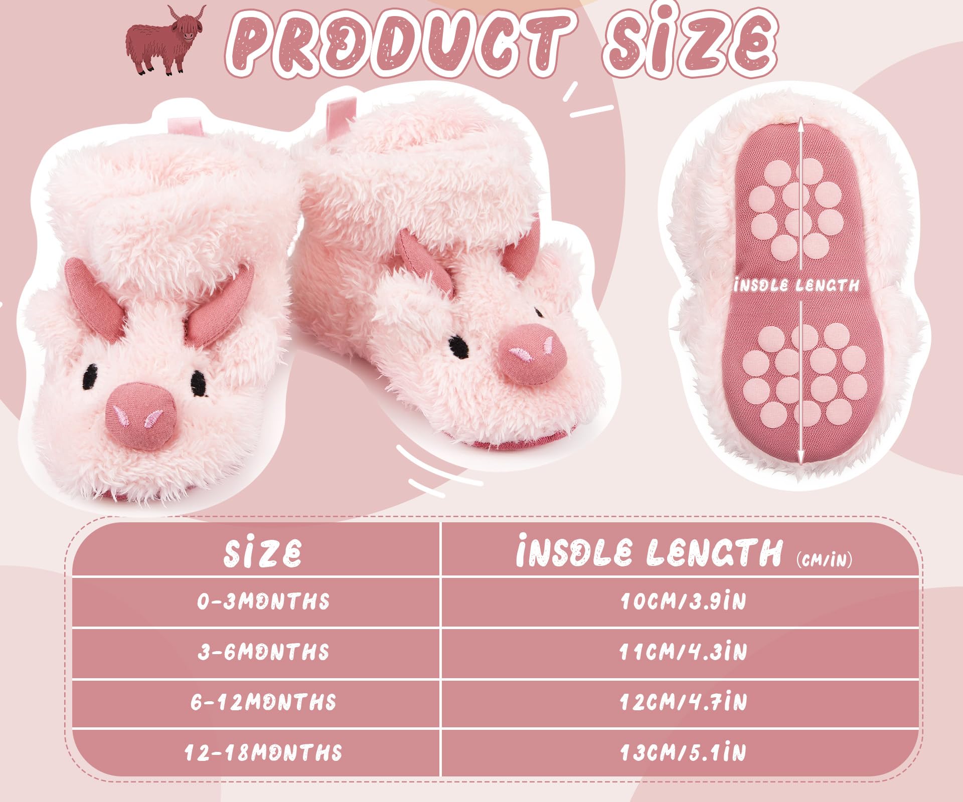 Description Features: Our booties feature non-skid soles to prevent your baby from slipping and falling when they start to walk and run. Specifications: Material: cotton Color: as the picture shows Size: 4.72 inch/6-12 Months Package includes: 1 Pair of highland cow slippers Notes: Manual measurement, please allow slight errors on size. The color may exist a slight difference due to different screen displays.
