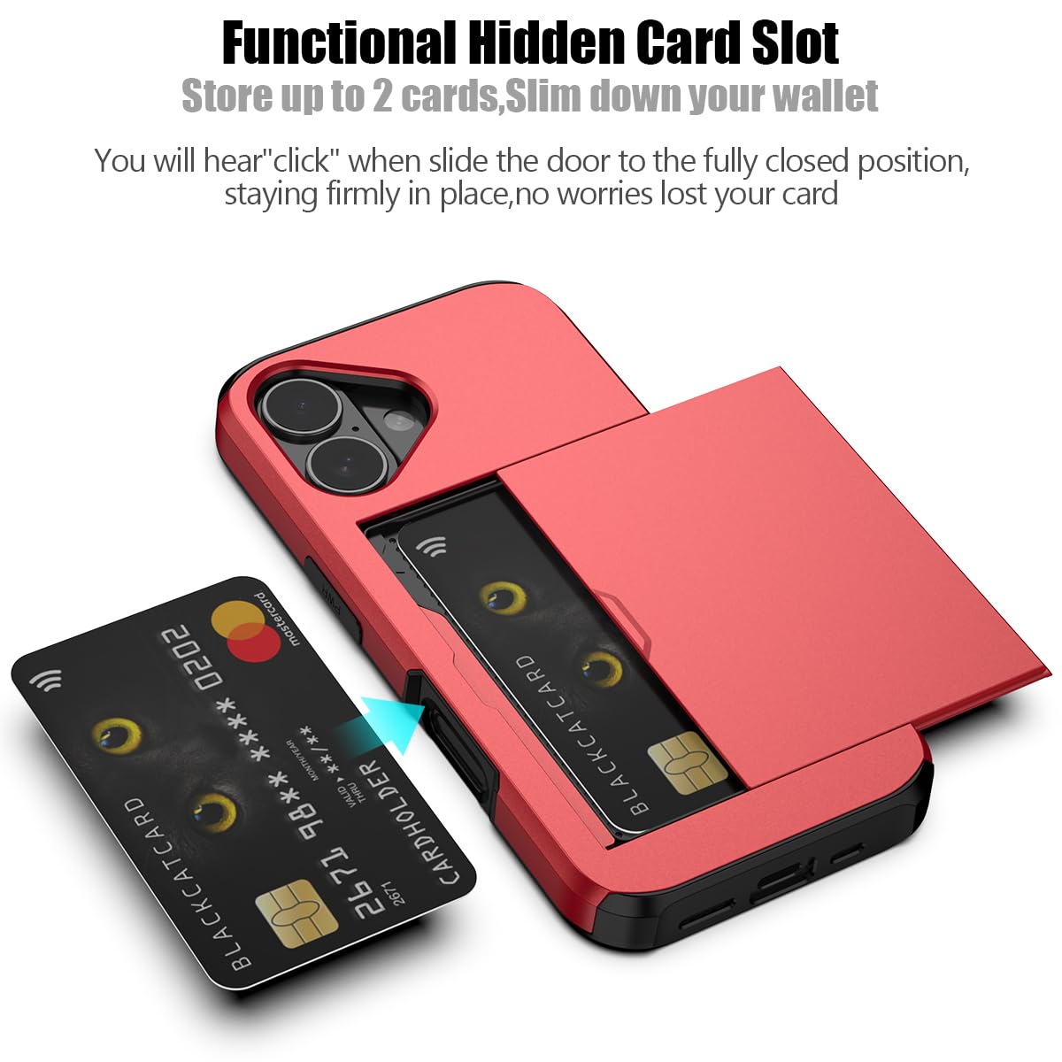 Hidden Card Slot Design: Slim down your wallet, store up to 2 cards,carry your ID and credit card instead of dragging your huge wallet everywhere,with all essentials in one hand,you will love how convenient it is. You will hear"click" when slide the door to the fully closed position,the slider staying firmly in place,no worries lost your card.