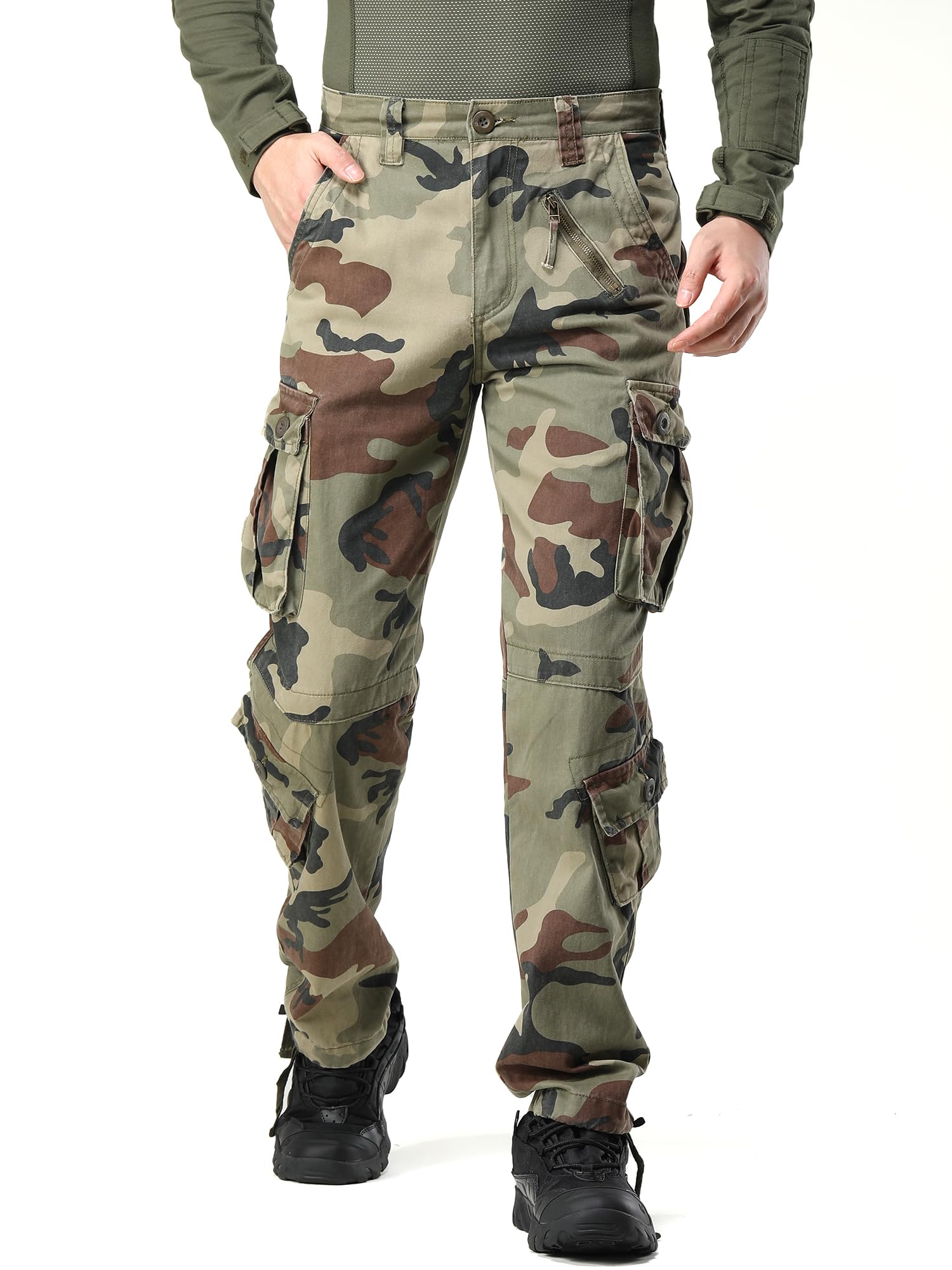 Product Design:Classic cargo pants with 8 pockets;they are all three-dimensional design,2 flat slant pockets for hands-free use and convenient access,4 cargo pockets provide secure equipment storage,2 back buttoned pockets provide deep, secure storage that makes it easier to carry additional personal things,also,one left front zipper fake pocket is a good decoration..Designed with a relaxed fit through the seat and thigh, these men's casual wear will keep you comfortable during any task.