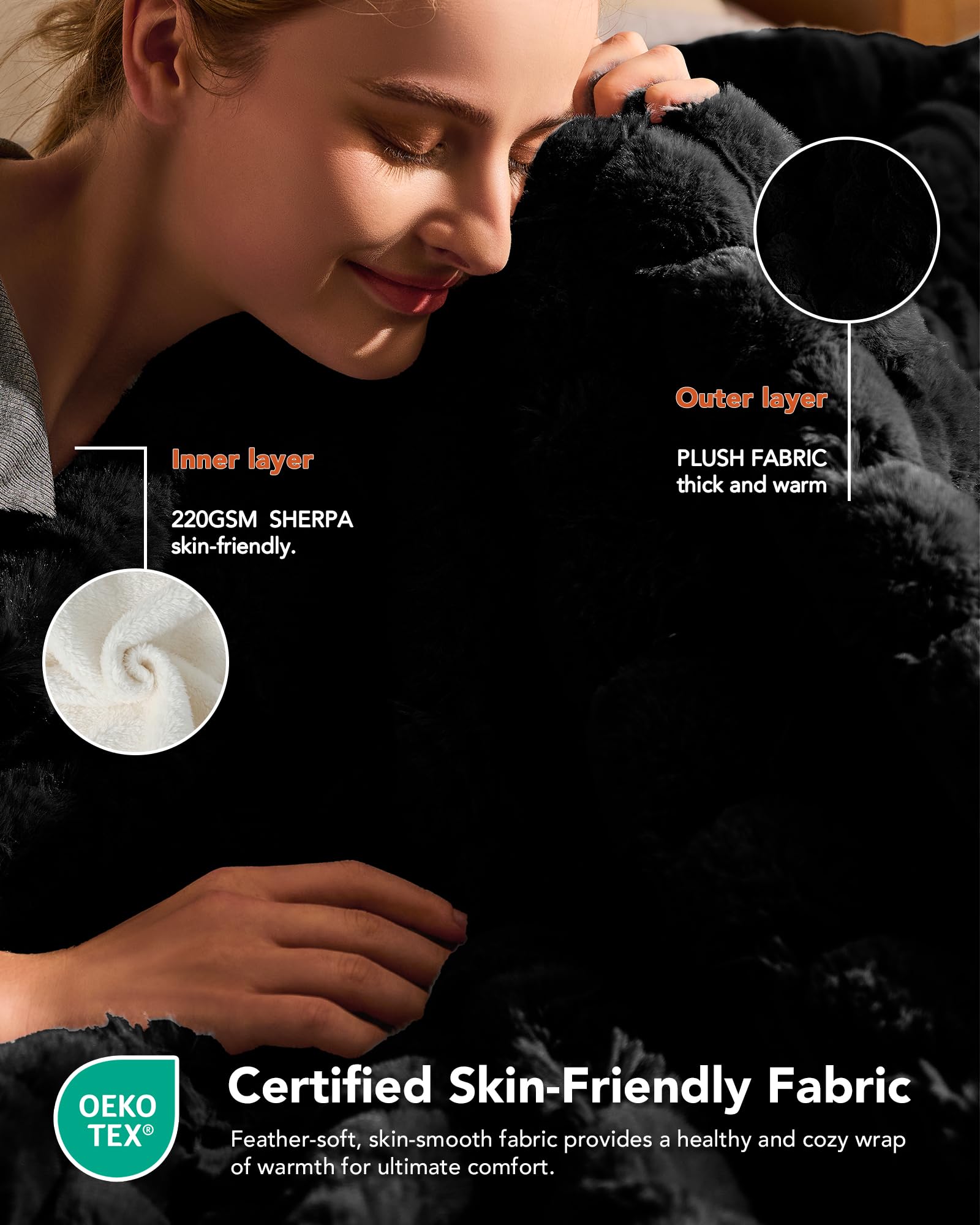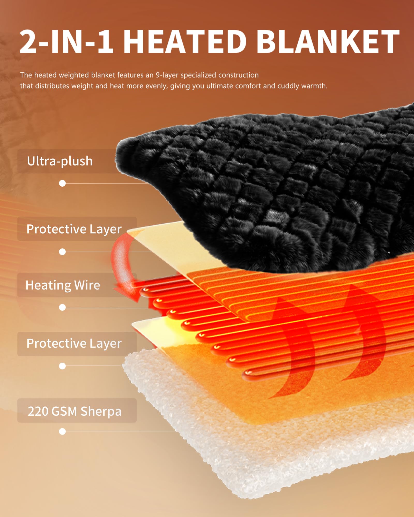 PREMIUM MATERIAL: 800gsm Faux Fur + 200gsm sherpa.The fabric is very soft,thicker than normal blankets,and warmer than normal blankets even without electricity.The fabric is durable and does not shed.The diameter of the heating wire is 2.2 mm,and the existence of the heating wire is hardly felt during use,which is more comfortable.