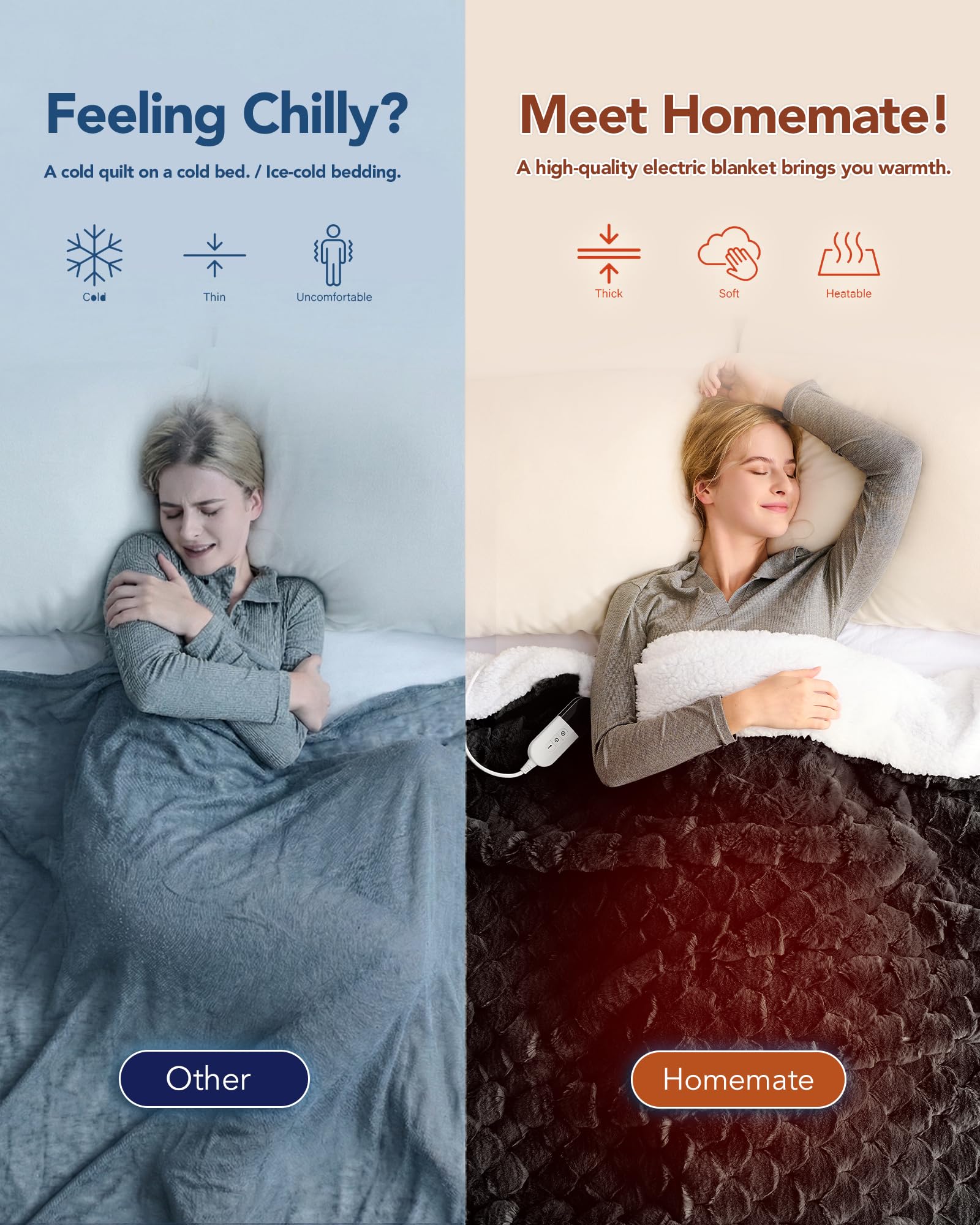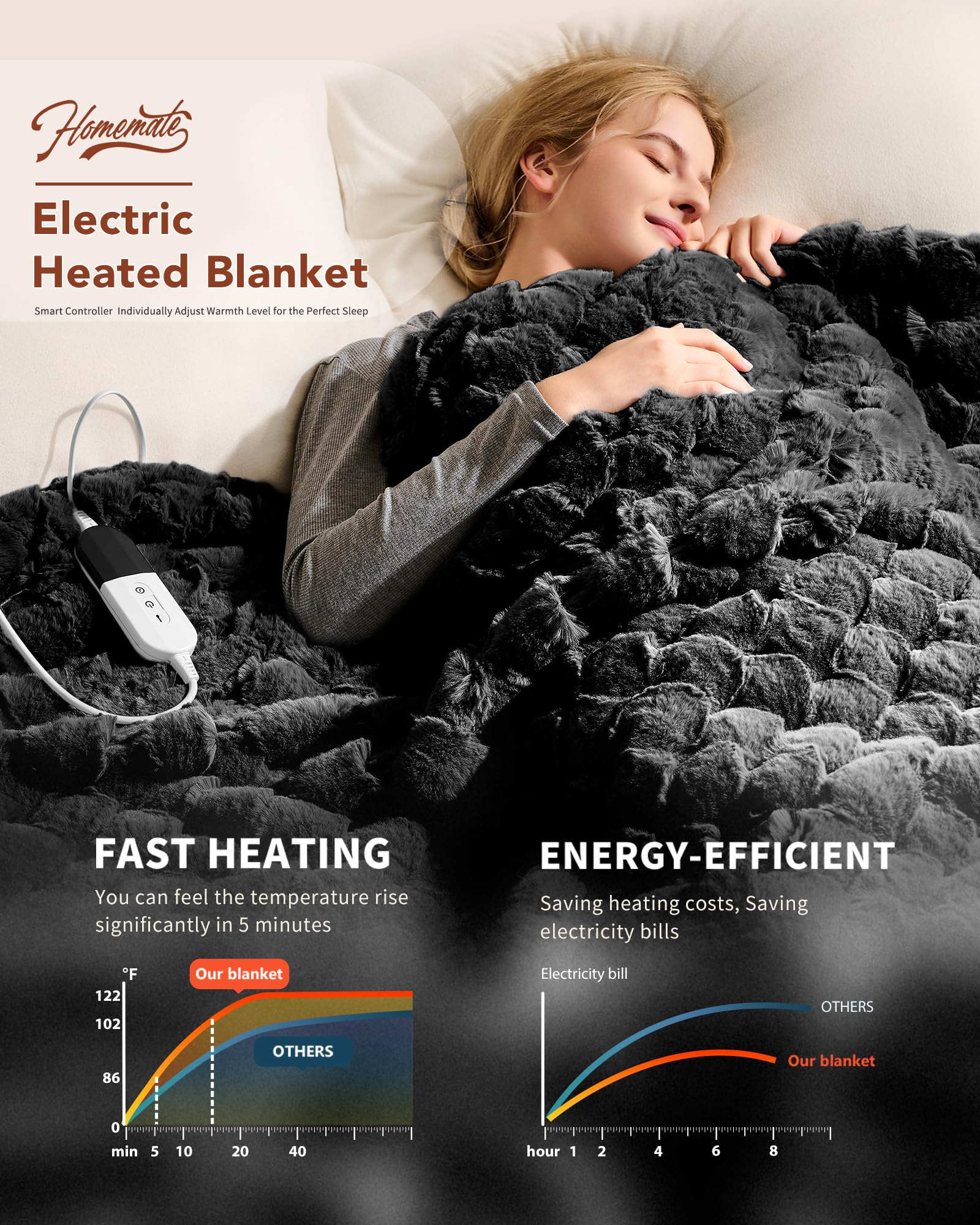 ENERGY SAVING: Homemate heated blanket use the intelligent temperature adjustment technology.When the temperature rises,the heated blanket will automatically adjust the temperature according to the surrounding environment,which can always provide users with a comfortable feeling and is conducive to energy saving.Compared with air conditioner,using Homemate heated blanket is more energy efficient,and you can save more heating costs in winter.