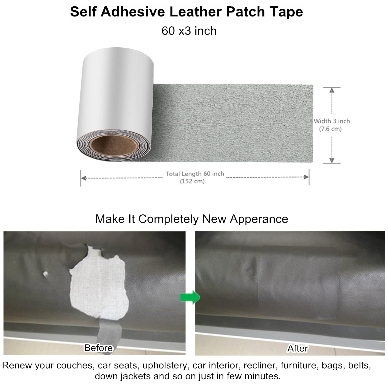 ✄【Wide Applicability】Quick fix leather repair patch first aid works perfectly on leather and vinyl products. Applicable for couches, sofas, boat seat, car seats, car interior, recliner, furniture, upholstery, office chairs, bags, suitcases, belts, and down jackets. Great solutions for cat scratching, holes, burns, rips, tears or cracks. The repair patch is also applicable to a variety of DIY handcraft.