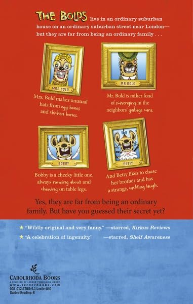 The Bold family seems fairly normal: they live in a nice house, the parents have good jobs, and they all love to have fun. One slight difference: they're hyenas. That's right―they're covered in fur, have tails tucked into their clothes, and really, really like to laugh. For years, the Bolds have kept their true identities under wraps. But now the neighbors are getting suspicious, and the Bolds are getting homesick. During a trip to the local wildlife park, they meet an old hyena who is going to be put down, and the Bolds have to act fast to save him―without revealing their secret!