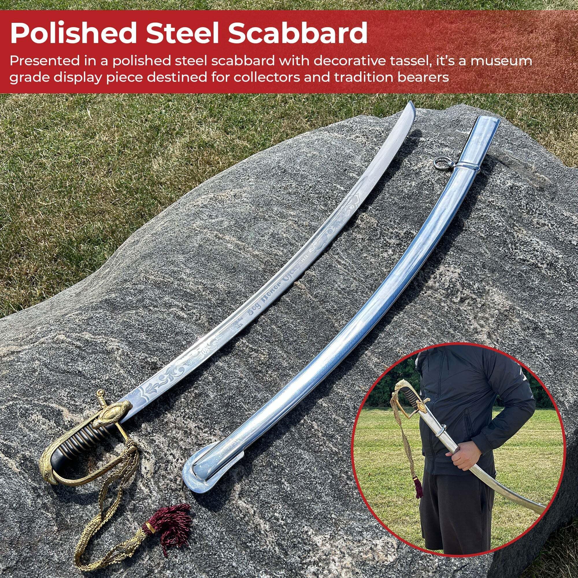 Celebrate Polish military heritage with this beautifully crafted ceremonial sabre. Featuring a polished EN45 carbon steel blade with authentic military motif engravings, this sword captures both historical significance and artisanal craftsmanship. The ornate metal hilt and guard complement the leather-wrapped grip, offering both elegance and comfortable handling. Presented with a matching metal scabbard and decorative tassel, this museum-grade display piece makes a distinguished addition to any collection for those who appreciate military tradition and craftsmanship.