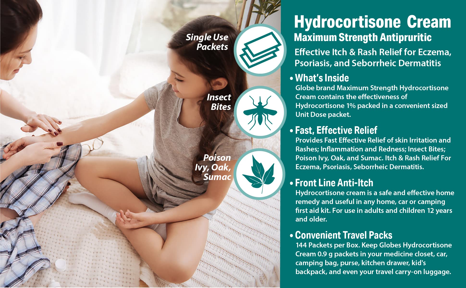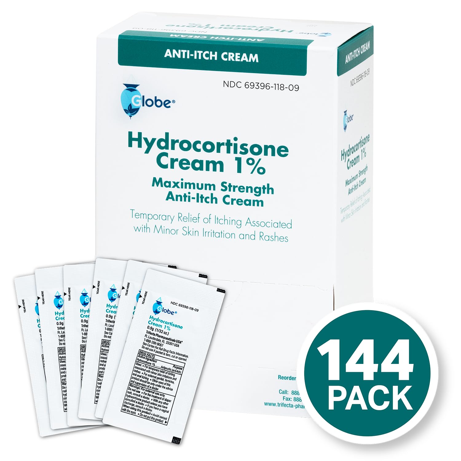 CONVENIENT TRAVEL PACKS: 144 Packets per Box. Keep Globes Hydrocortisone Cream 0.9 g packets in your medicine closet, car, camping bag, purse, kitchen drawer, kid's backpack, and even your travel carryon luggage. The convenience of the packet size can go with you anywhere.