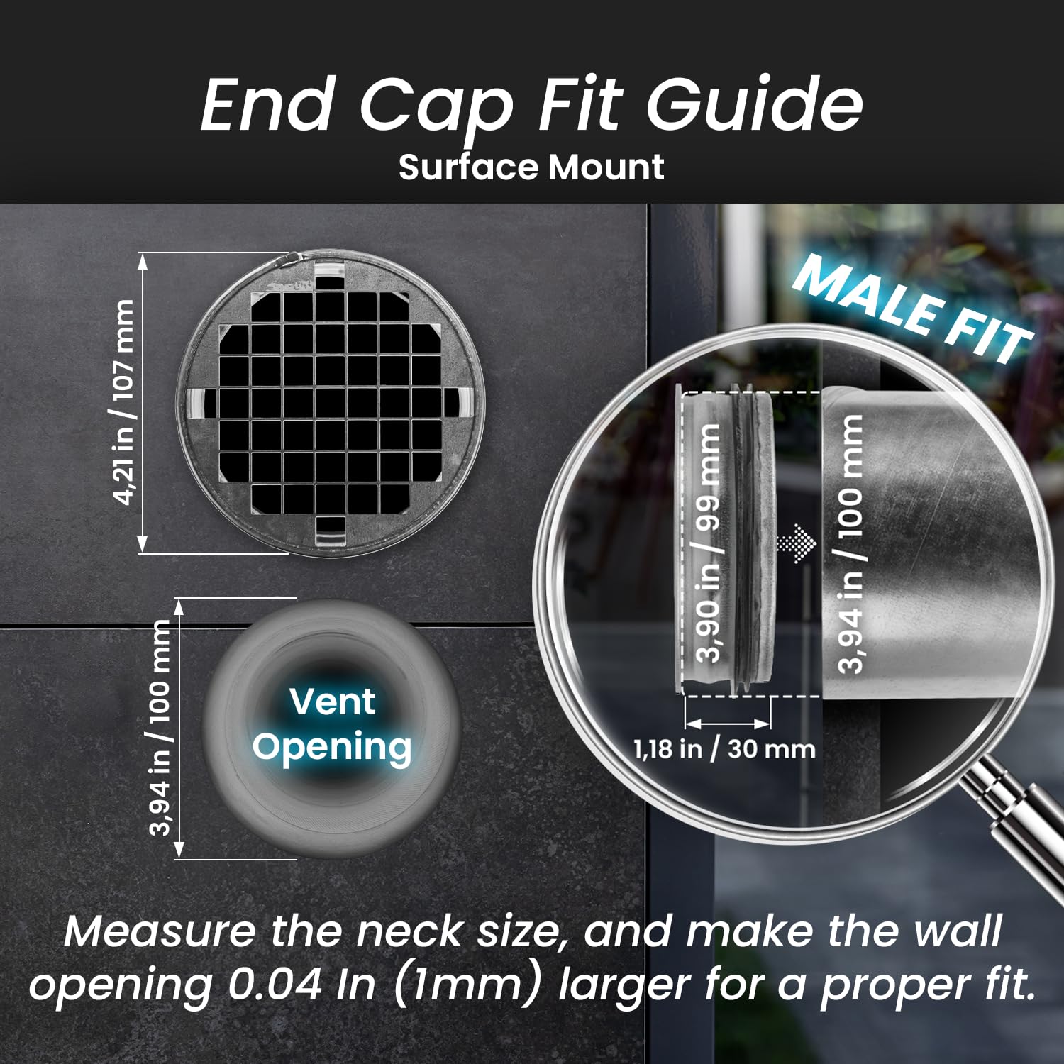 PRECISE SIZE & FIT – Ø3.90 inch galvanized steel duct end cap with 1.8 inch insertion depth and integrated 0.39 inch steel mesh grid. Designed for male-fit installation on standard HVAC ducts, dryer vents and ventilation pipes.