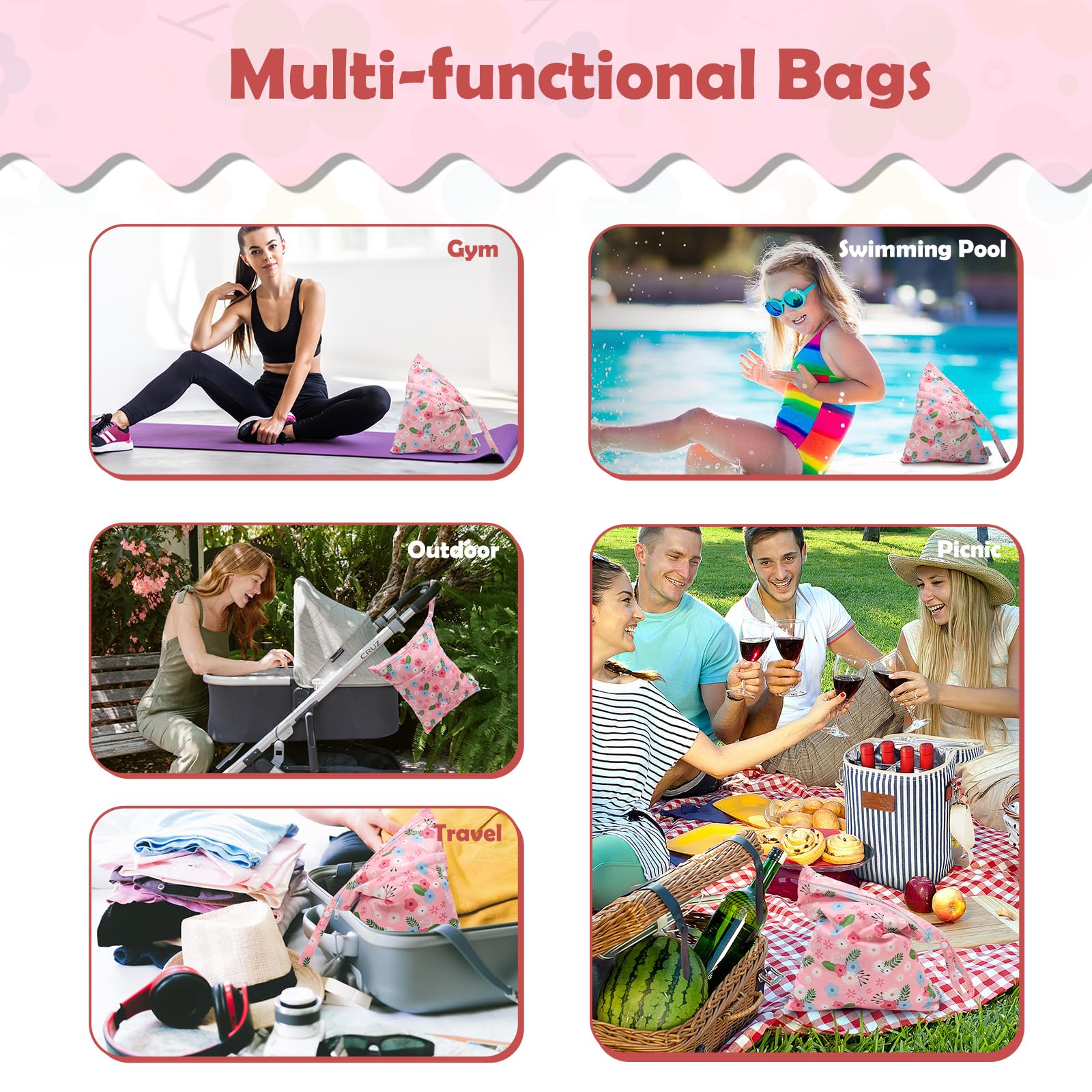 Multi-functional Bags-A truly wonderful bag that allows you to carry your wet and dry items in the same bag. Carry all your items in one bag while keeping your dry items dry and your wet or soiled items separate. Truly an all in one bag! They can be used as diaper wet dry bags,travel bags,storage bags,cosmetic bags,handbags,wash bag,organizer bags.