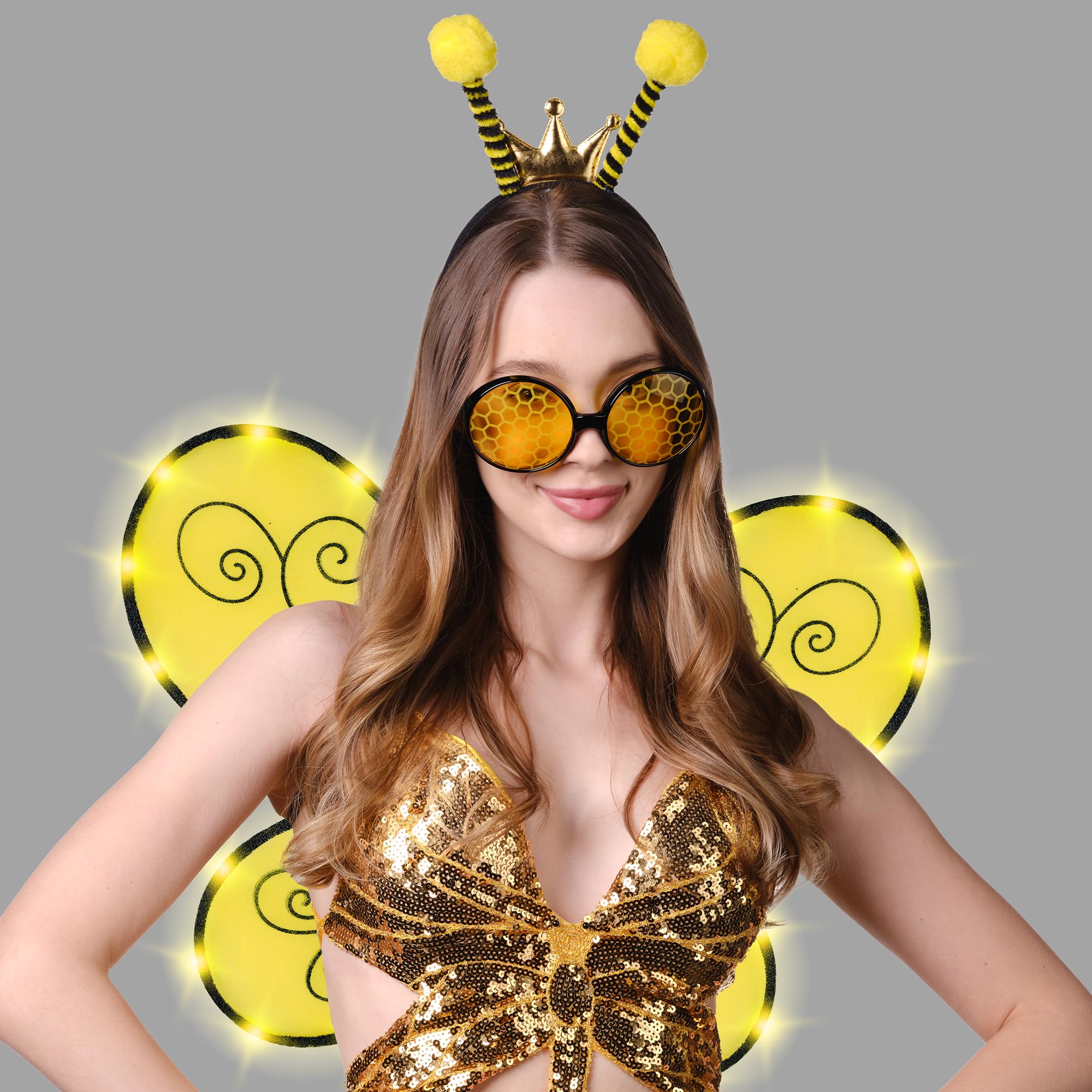 Complete Bee Costume Set: Get ready for fun adventures with our Bumblebee Wings, Antenna Headband, and Glasses combo! This set includes a vibrant yellow headband with antennae, glittery bee wings, and stylish sunglasses. Perfect for children, teens, and adults.