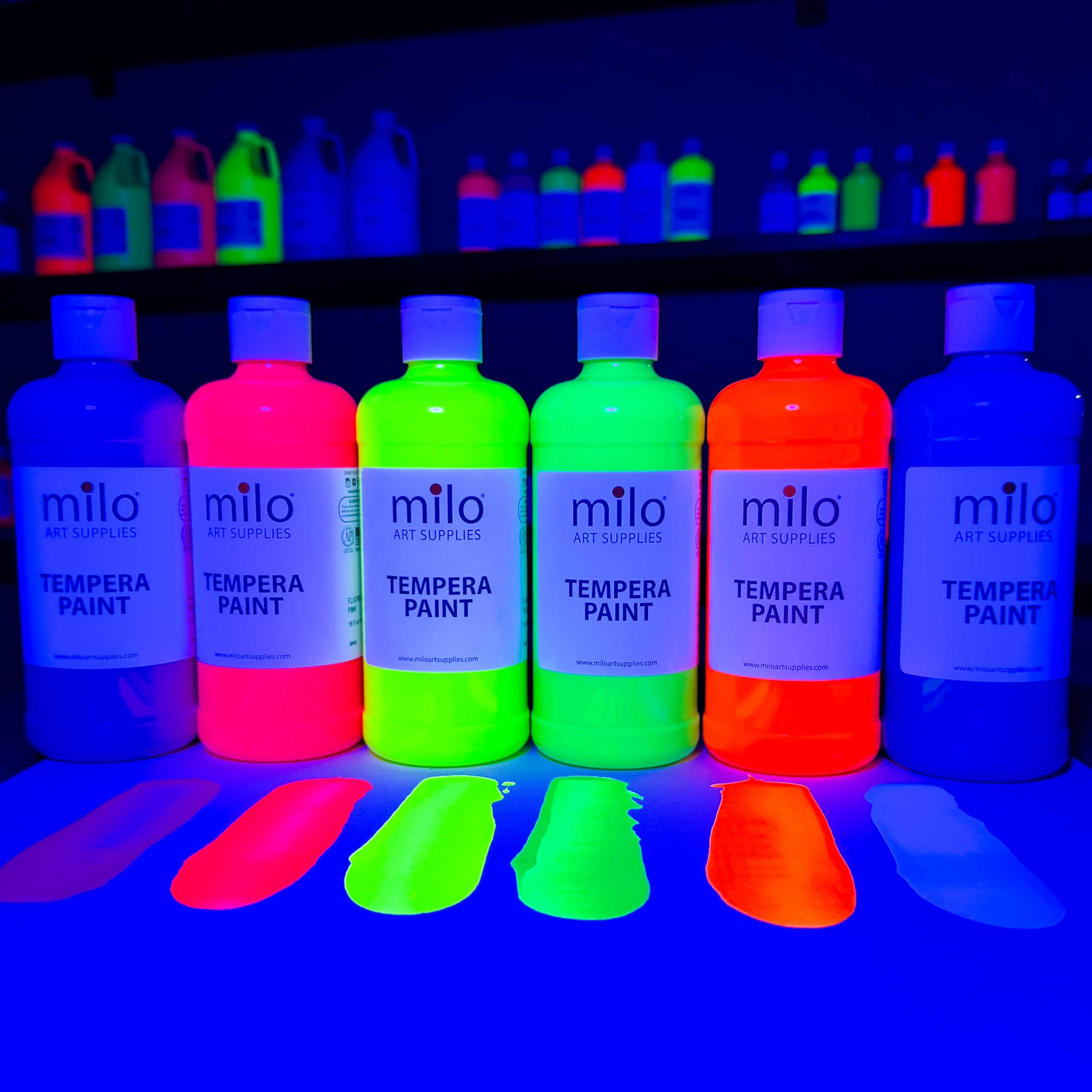 Bring a burst of electric color and light to your children's projects with the milo Fluorescent Neon Washable Paint Set! This exciting collection includes 6 dazzling, UV-reactive colors in large 16 oz bottles, delivering high-impact neon fun that is completely safe and designed for easy cleanup. Bring the electrifying fun of black light art to your kids' next project!