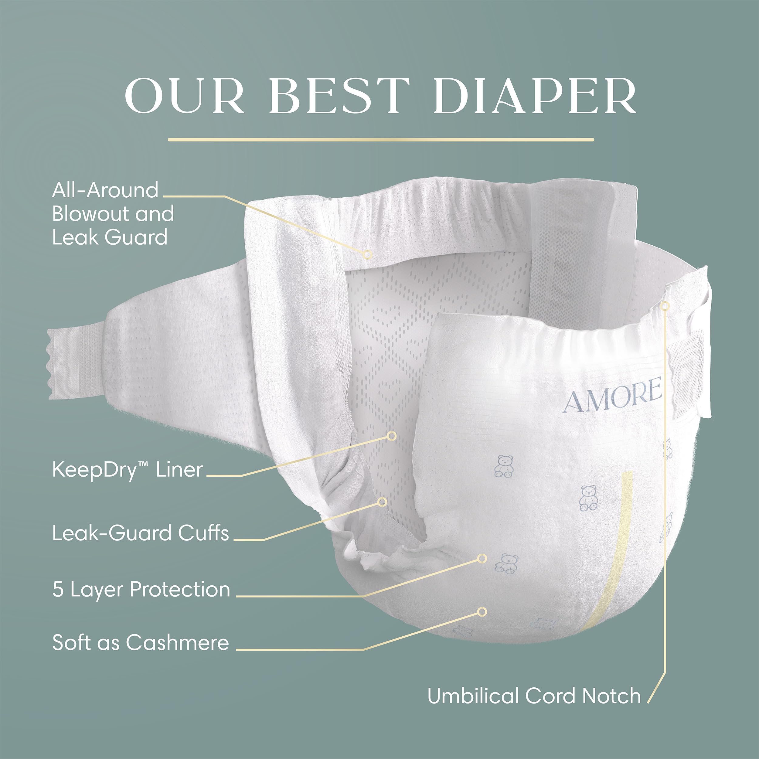 Introducing Pampers Amore—our best diaper. Thoughtfully crafted with 60+ years of Pampers quality and expertise, reimagined for today. Built with 5 layers of protection, it is our most absorbent diaper*. Pampers Amore diapers feature an all-around blowout and leak-guard barrier to help prevent up to 100% of leaks. Plus, they are built with our KeepDry liner for unbeatable dryness and comfort**. These diapers provide premium performance without compromise. They are Dermatologically accredited by the Skin Health Alliance and tested for 1000+ Harmful Chemicals. They are hypoallergenic and free of fragrance, parabens, elemental chlorine and latex (no natural rubber). Because real luxury means peace of mind. Pampers Amore diapers are designed with the finest materials. They are soft as cashmere, making them extra gentle on your baby’s delicate skin. Each diaper features delicate patterns as cute as your little one with a wide wetness indicator that lets you know when they go. Because when it comes to love, there's no such thing as good enough. Give them the best. Pampers Amore—made with love in every detail.among U.S. non-overnight taped diapers; excluding Super Economy Pack **Based on size 4 Pampers Amore. 3 typical wettings of 75ml under 0.5psi pressure. Among day-and-night taped diapers