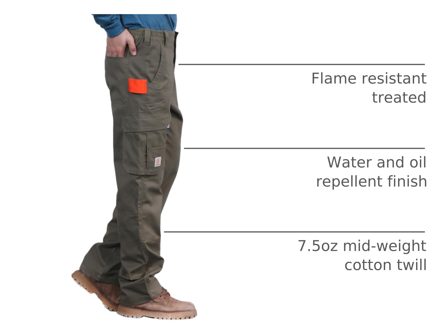 FASION AND COMFIT:This FR Work Pant has 7 Pockets and Elstic waist band, Provides A Perfect And Comfortable Relaxed Fit(Boot Cut). Double front fabric on knee.Double needle stitching on outseam. Left and right enlarge cargo pockets at the thighs with flaps to keep items secure.Two back cargo pockets help yop holding more stuff.We Did Prewash/ Preshrunk And Wrinkle-Free.Machine Wash No Shrink!