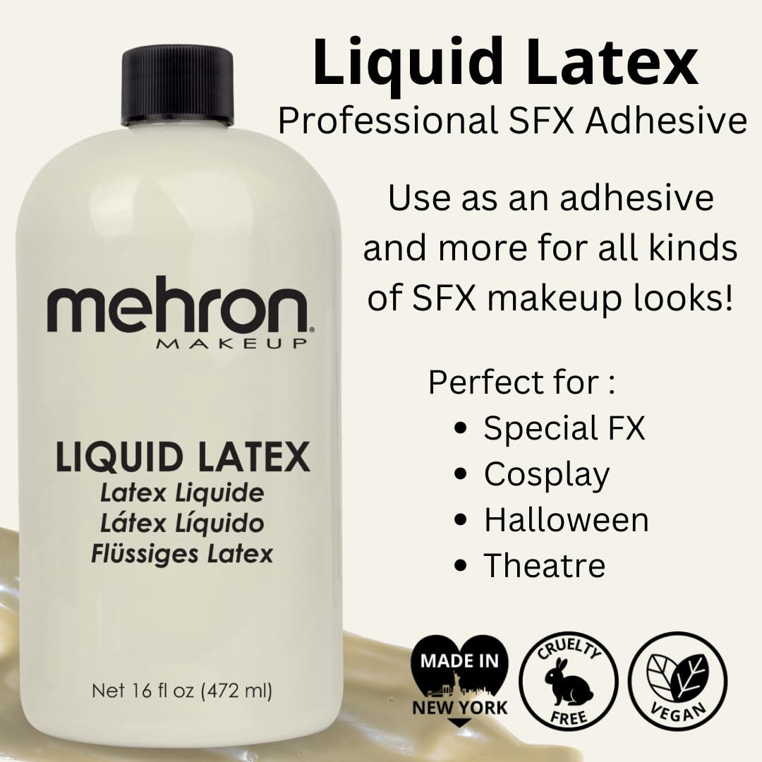 PROFESSIONAL: Mehron's Liquid Latex is a professional, vegan formula that can be used as an adhesive to attach appliances to the skin, to seal wax, or to create textured effects like aged or peeling skin. True professional grade, trusted by Hollywood and Broadway pros since 1927.