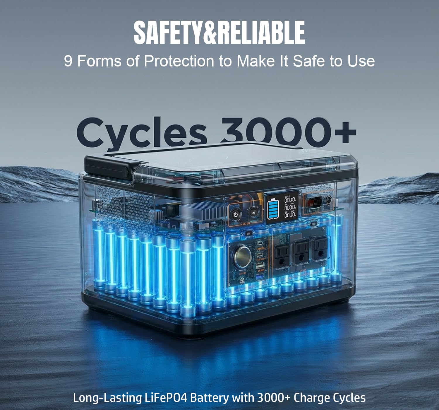 【LiFePO4 Battery 576Wh (180,000mAh)】 Built with durable LiFePO4 battery cells, this power station offers over 3,000 charge cycles.
